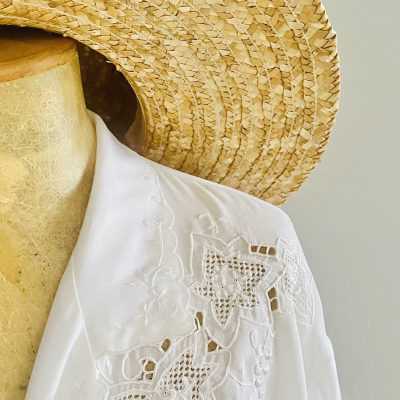 Camisa vintage de la marca Kavita. De poliéster en color blanco. Con cuello sastre y bordados en pecho, solapas y puños. Talla: 42. 15,95€.