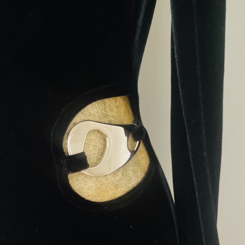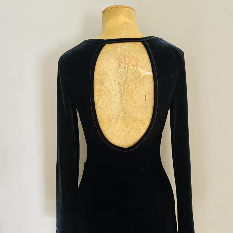 Este vestidazo de la casa francesa Sinéquanone tiene todo lo que nos gusta para un vestido de fiesta de invierno: tejido elástico y calentito de terciopelo, de cuello cerrado y manguita larga pero con escotazo en la espalda y abertura sexy en un lado de la cadera. De color negro, impecable y como nuevo. Vestido Sinéquanone Paris, talla S, 49’95€.