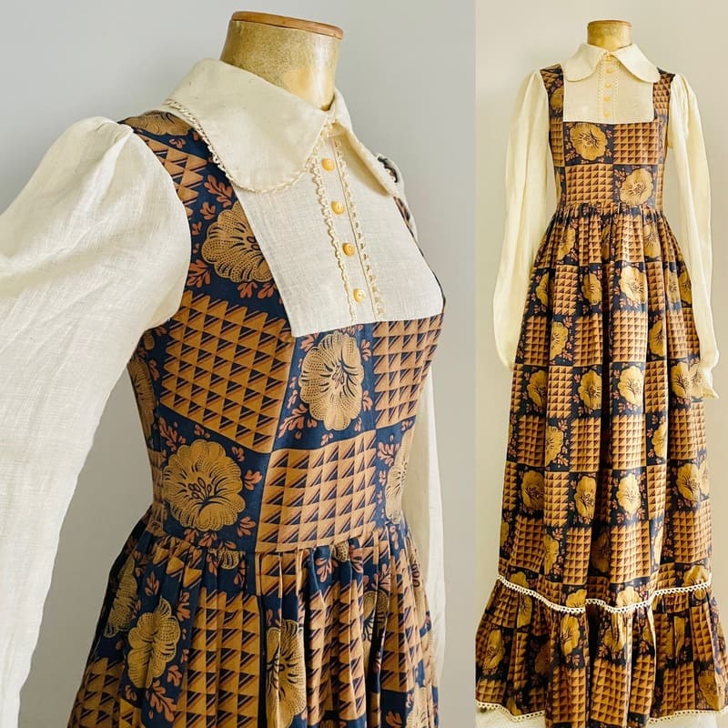 Sabéis que nos encantan los 70 y el look de hoy es setentero 100%. Aquí una bata maravillosa, que por supuesto la usamos también de vestido, sería un delito no lucirla en la calle. Y le sumamos dos accesorios en azul a juego; gafas de sol maravillosas y gargantilla rígida.