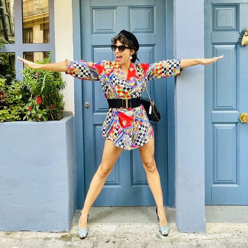 Si el blazer que eliges es como el nuestro, bien de colorinchis, lo ideal es elegir como aquí todos los accesorios en negro u otro color liso neutro; turbante, cinturón, tacones, gafas y bolso.