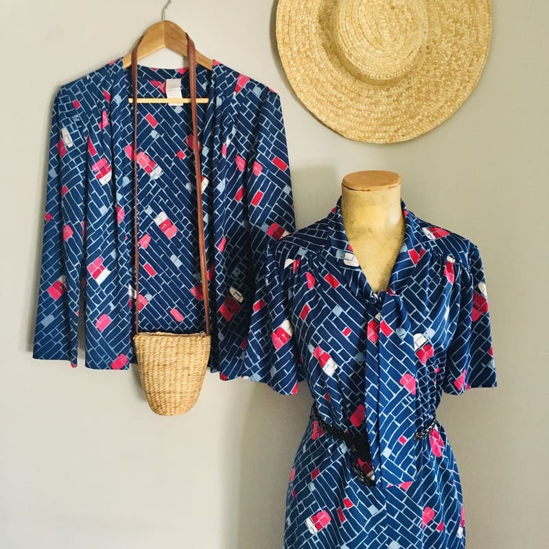 Como llega el mes del ‘entretiempo’ estamos deseando ponernos conjuntos de dos piezas con chaquetita como este, que solo podemos usar en primavera u otoño. Así que hoy os proponemos este precioso conjunto tan original de vestido y chaquetilla o kimono corto de los 80. Hecho en Francia, de la casa Paul Mausner Paris, 100% poliéster y de color azul con estampado formando rectángulos grises con detalles en rosa.