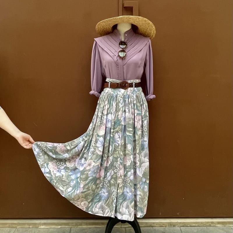 Falda vintage de los ochenta de la marca Radar. De largo midi, cintura alta entallada con trabillas para cinturón y abotonada por delante de arriba a abajo. Estampado floral en tonos pastel en lila. De viscosa y poliamida. Talla S/M. 24’99€.