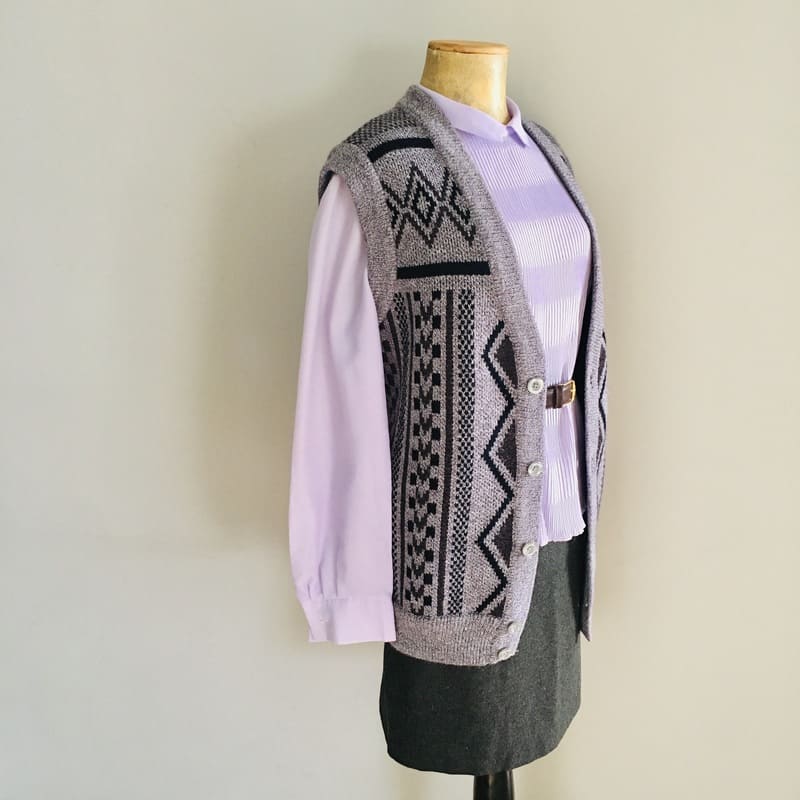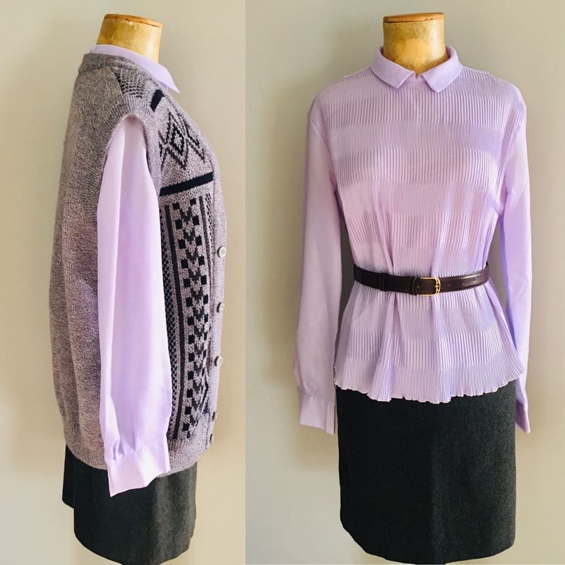 En este caso hemos combinado prendas para crear un look en tonos lavanda y gris, los colores del chaleco. Hemos elegido una blusa lila plisada de los 80 con una falda recta de paño en gris marengo. Y hemos superpuesto un cinturón sobre la blusa para acentuar la cintura, creando un conjunto que aunque formal, resulta muy relajado y cómodo al añadirle el chaleco.