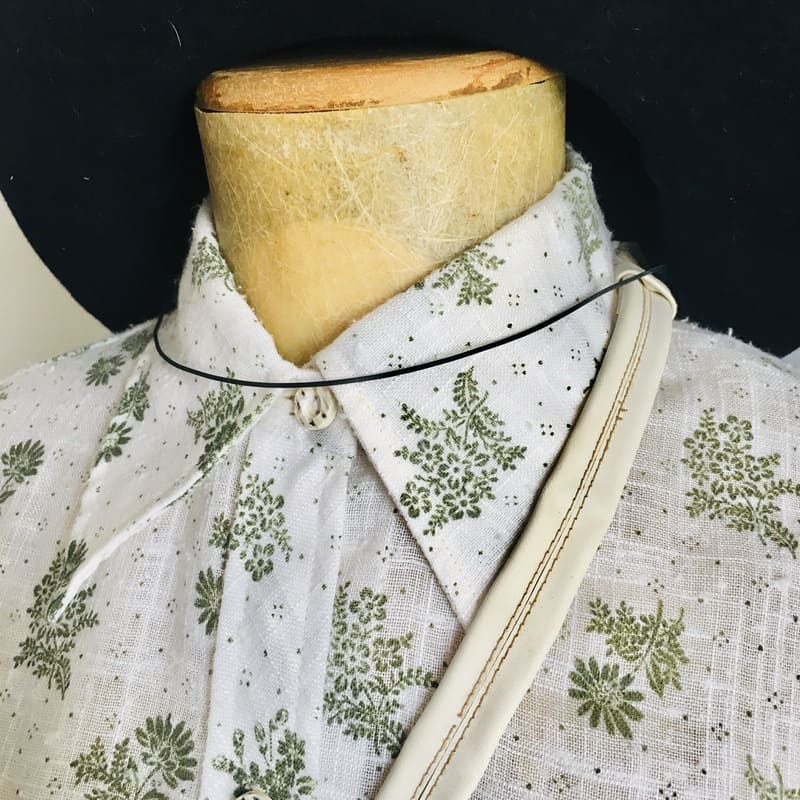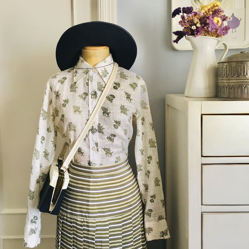 – Camisa Tea. Camisa vintage de los añOs 70 impecable y como nueva. Entallada, con cuellos de camisa setenteros y botones marfil con detalles verdes. De color blanco roto con dibujos de hojas y flores en verde. Composición desconocida. Talla M/l, 38/40. 15,95€ VER/COMPRAR
