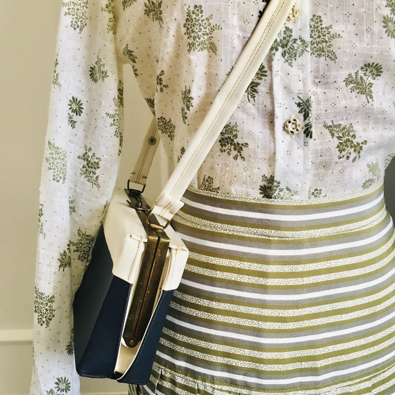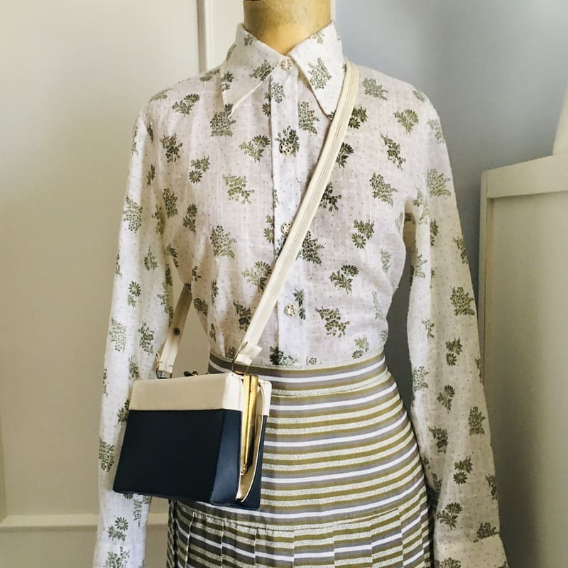 – Bolso Aurora. Bolso vintage original de finales de los 60. En forma de cajita/acordeón. De color azul marino y blanco roto. Tejido sintético impermeable por fuera y por dentro. Interior color ocre con dos bolsillos. Asa extensible. Acabados metálicos en dorado oscurecido por el paso de los años y con pátina. En perfecto estado. 18’95€ VER/COMPRAR