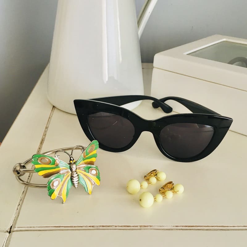 Y acabamos con tres accesorios, pulsera cromada y pendientes ambos con tonos verdes y nuestras gafas básicas de ojo de gato que tenemos siempre en stock.