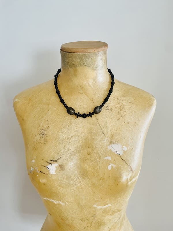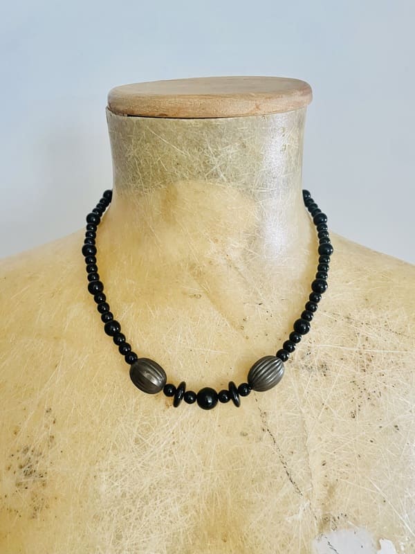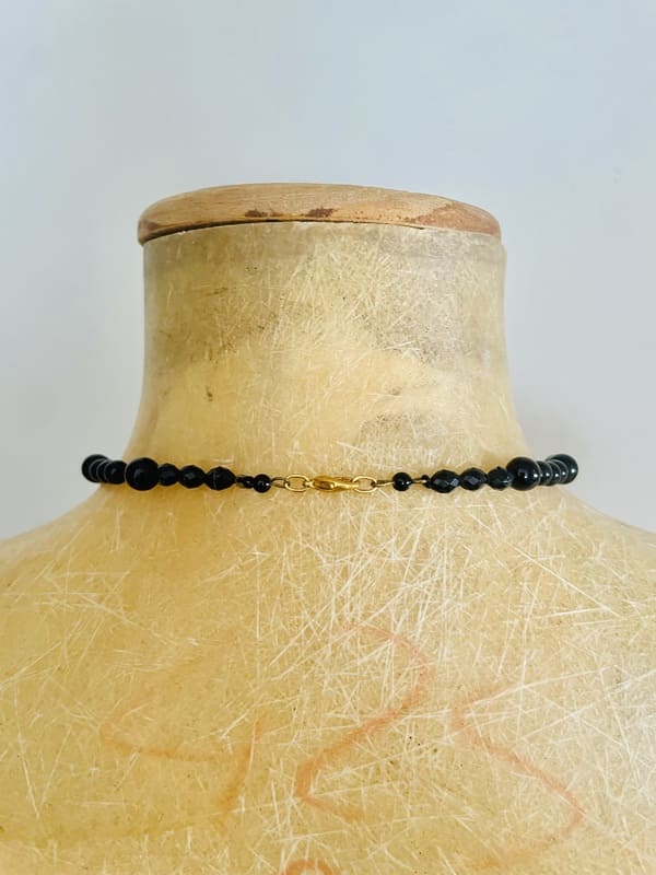 Gargantilla vintage con piedras en color negro y cobre, con acabados metálicos en dorado. Impecable, antiguo stock de bisutería de los años setenta.