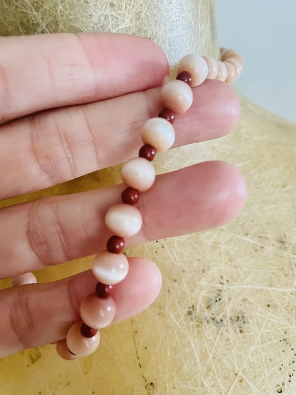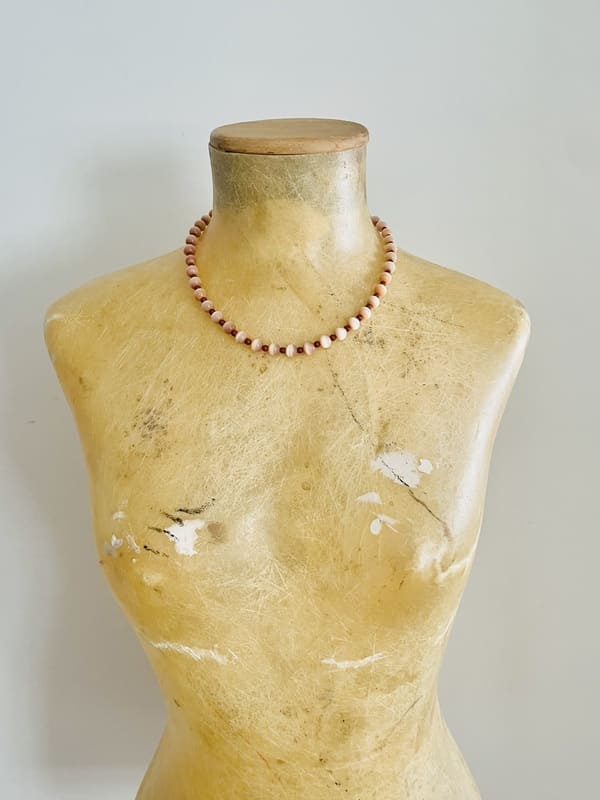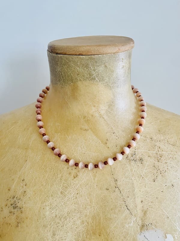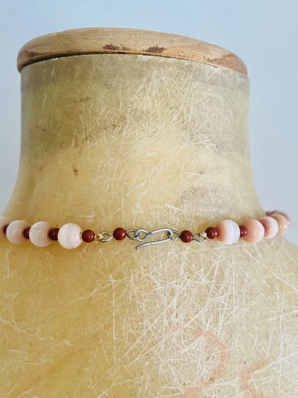 Gargantilla vintage con piedras en color coral, con acabados metálicos en plateado. Impecable, antiguo stock de bisutería de los años setenta.