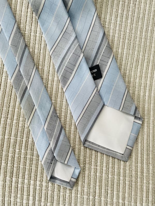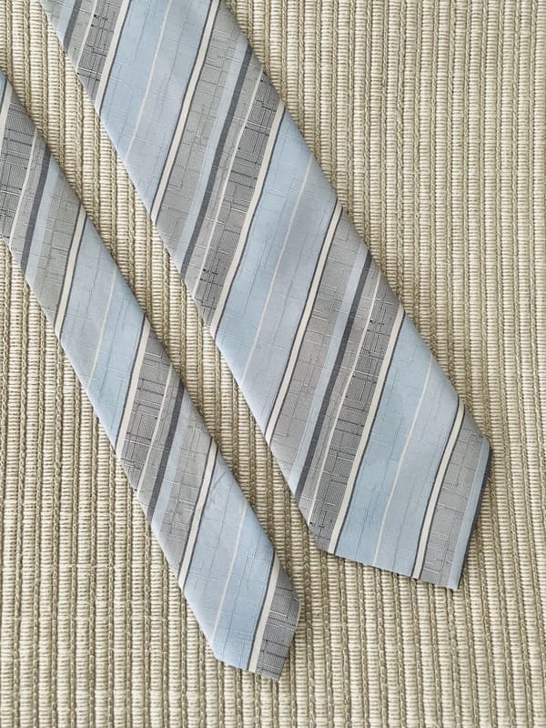 Corbata vintage de poliéster 100% de los años setenta. En tonos azules y grises pálidos a rayas oblicuas. Nueva, antiguo stock de la época.