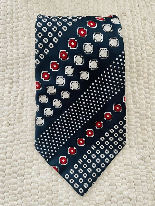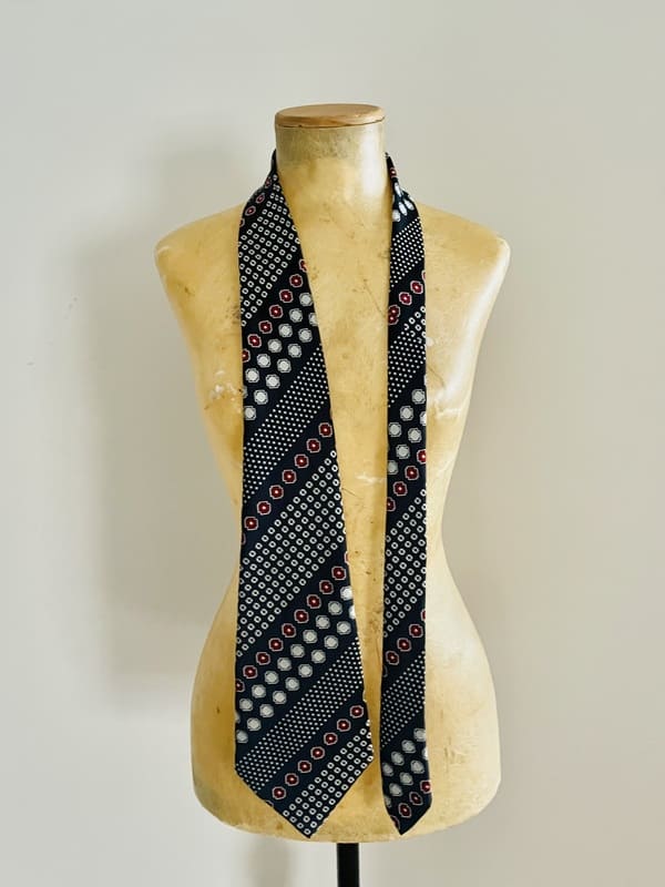 Corbata vintage Crecor de los años setenta. De Tegasa Jaén. Made in Spain. 100% poliéster. De color azul marino con dibujos de flores y lunares en blanco y rojo. Impecable.
