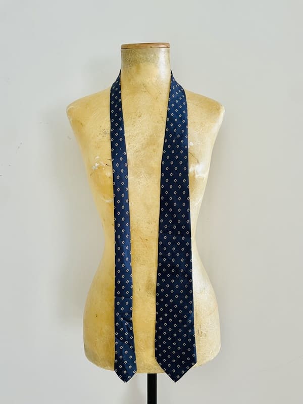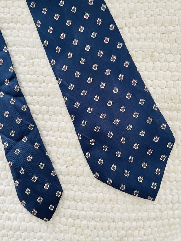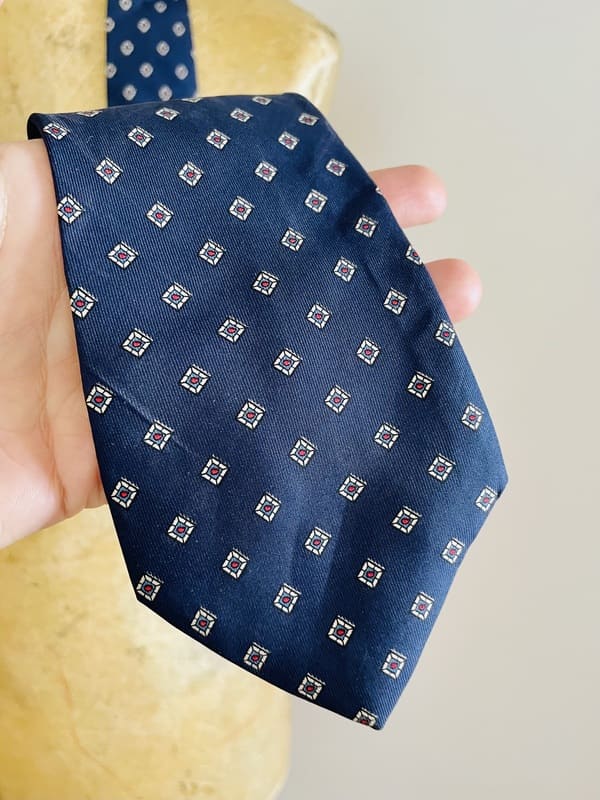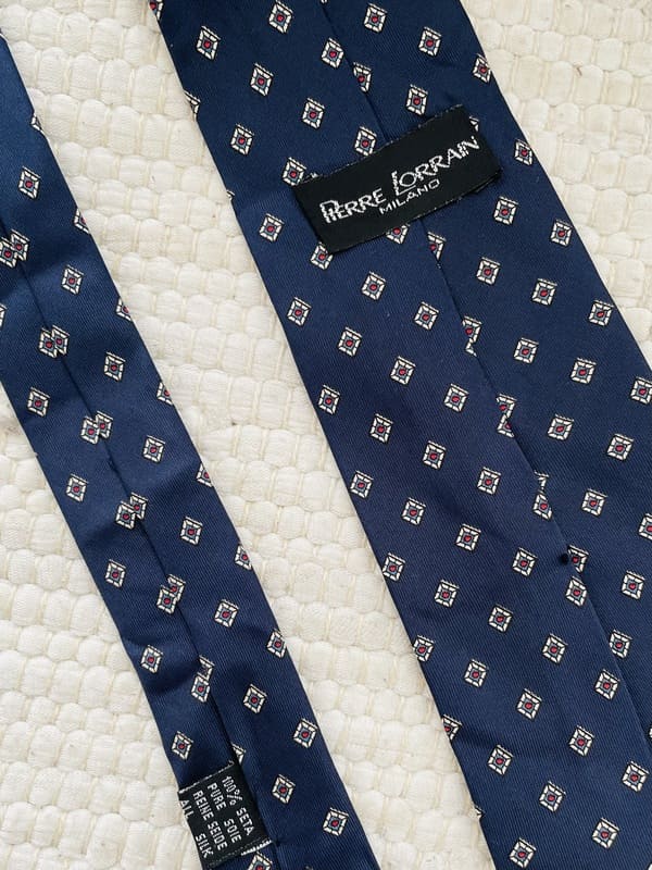 Corbata vintage de Pierre Lorrain, Milano. De seda q00%, Made in Italy, De color azul marino con motivos de rombos en blanco y rojo. Impecable, como nueva.