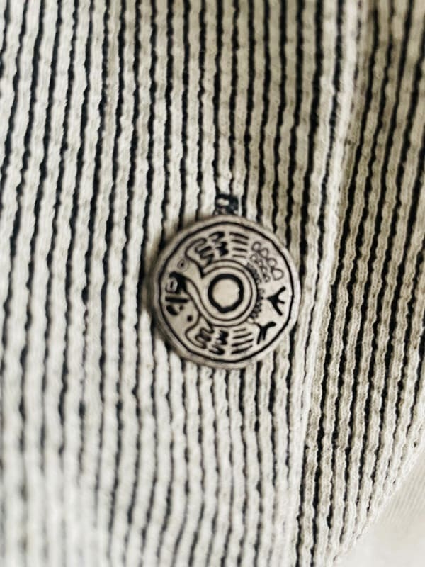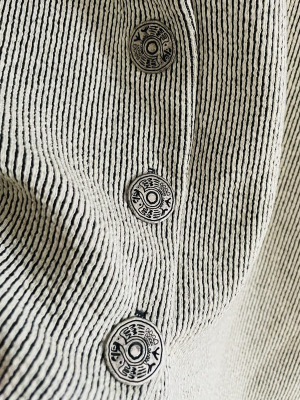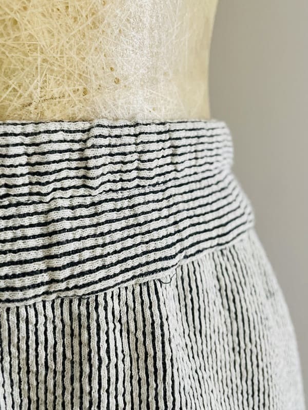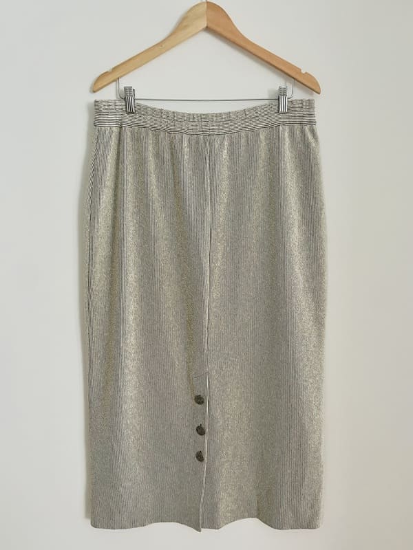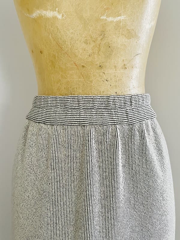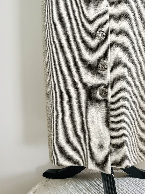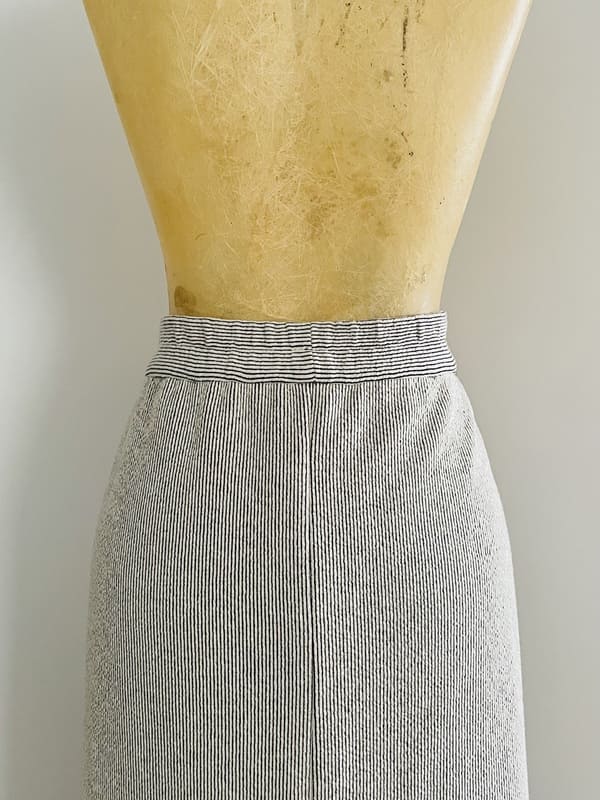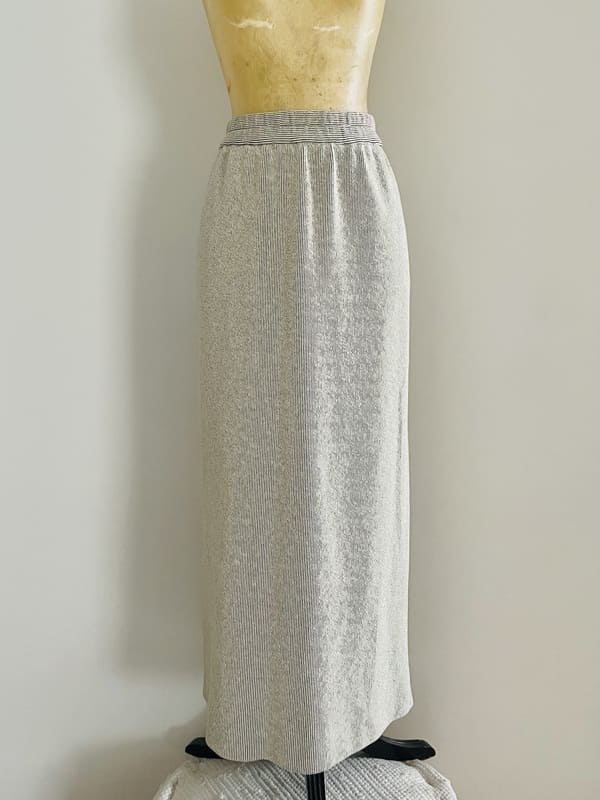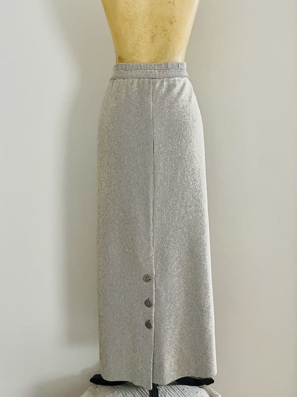 Falda vintage de largo tobillero de los años ochenta. De color gris claro con líneas finas verticales en negro. Tejido elástico acrílico y forro en blanco de poliamida. Lisa, reca, con cinturilla elástica y detalle de rajita con tres botones por la parte de atrás. Impecable, en perfecto estado.