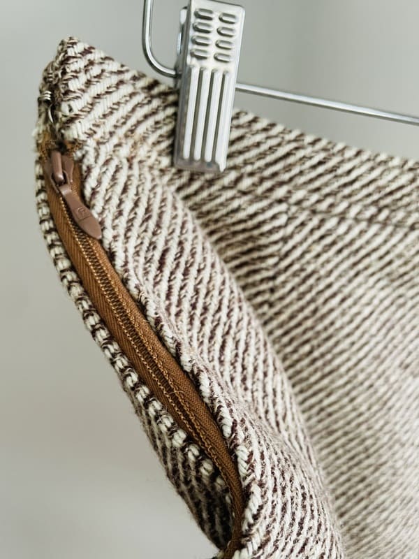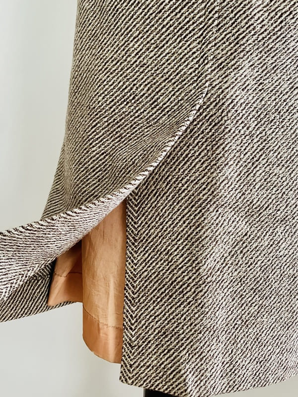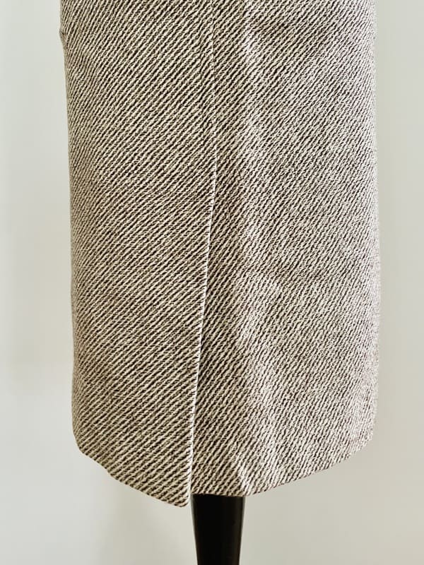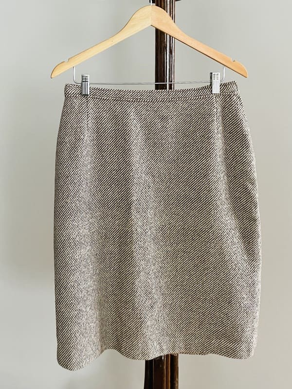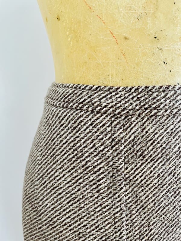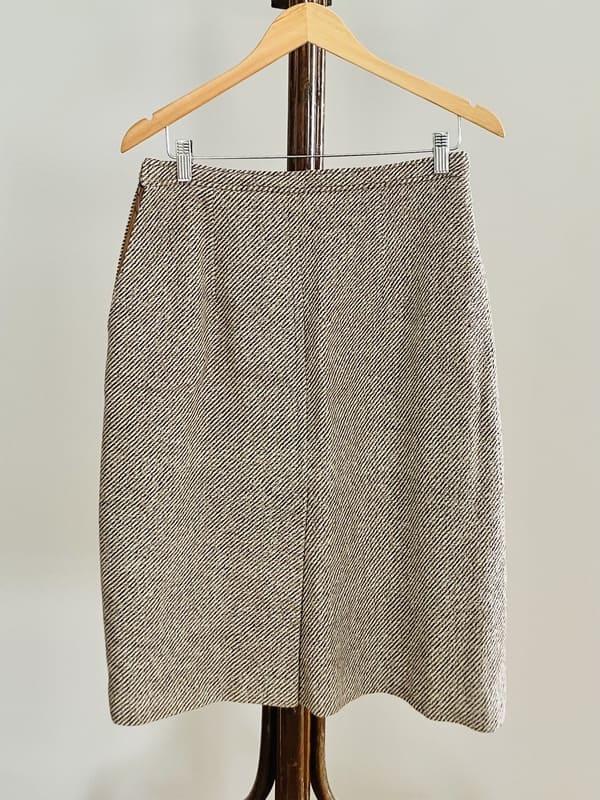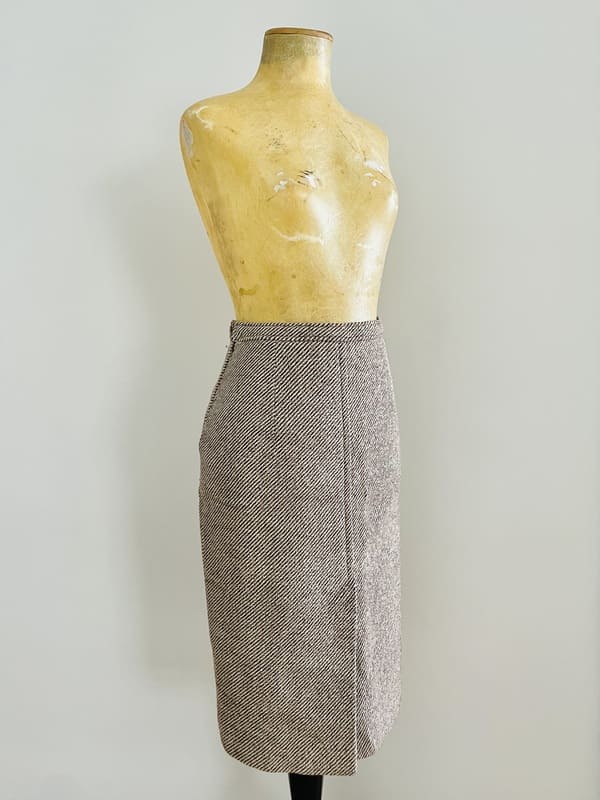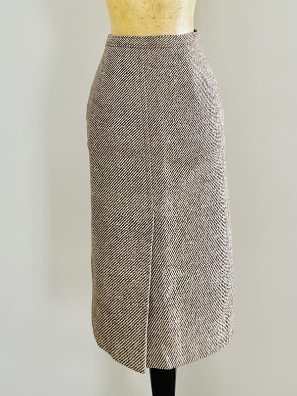 Falda vintage de largo midi. Años setenta. De tejido grueso en color marrón y beige jaspeado. De forma recta, entallada en cintura, con raja por delante y cierre con cremallera y corchete. De lana y con forro de acetato. En perfecto estado.