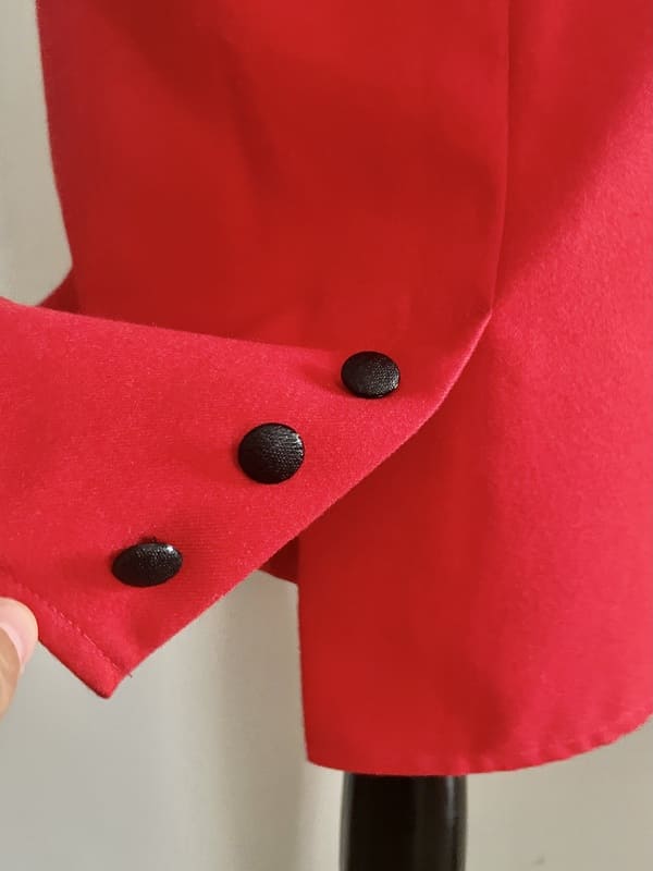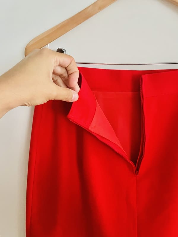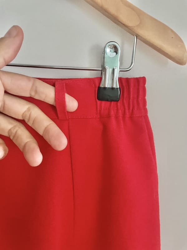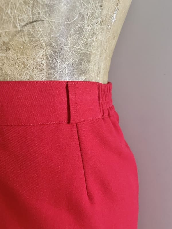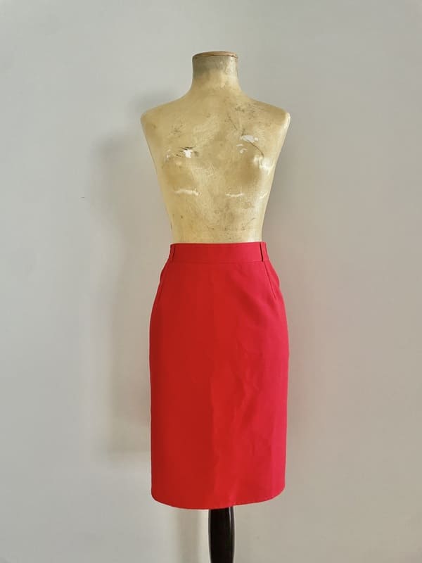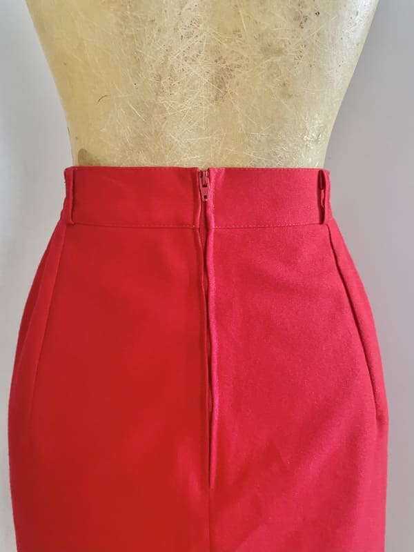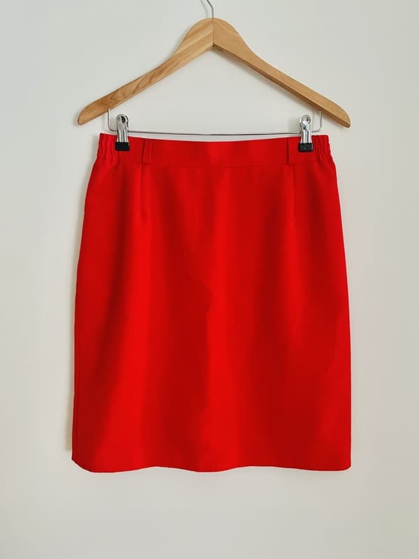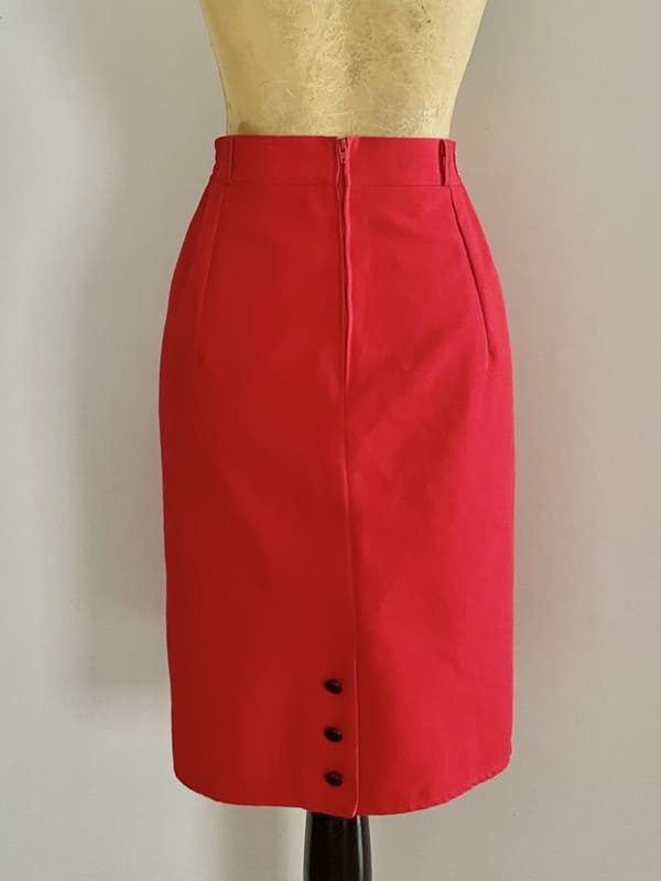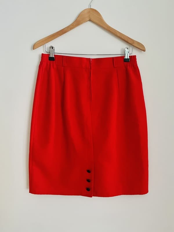 Falda vintage recta de color rojo de los años ochenta. Tejido de poliéster, con forro de poliamida. Con detalle de tres botones negros en la raja por la parte de atrás. Cintura con fruncido elástico, trabillas para cinturón y cierre con cremallera. Impecable, como nueva.