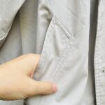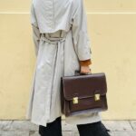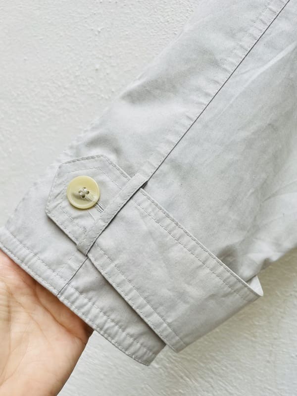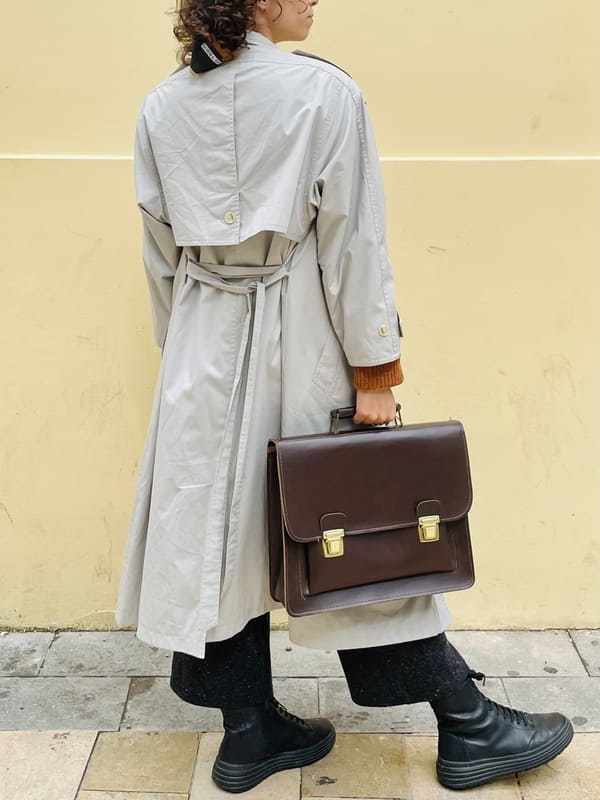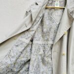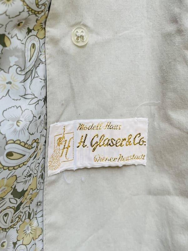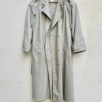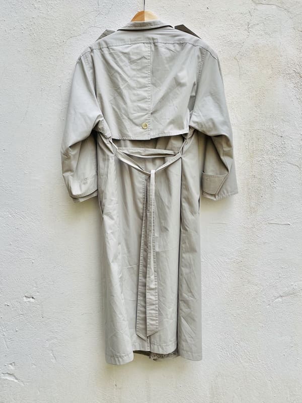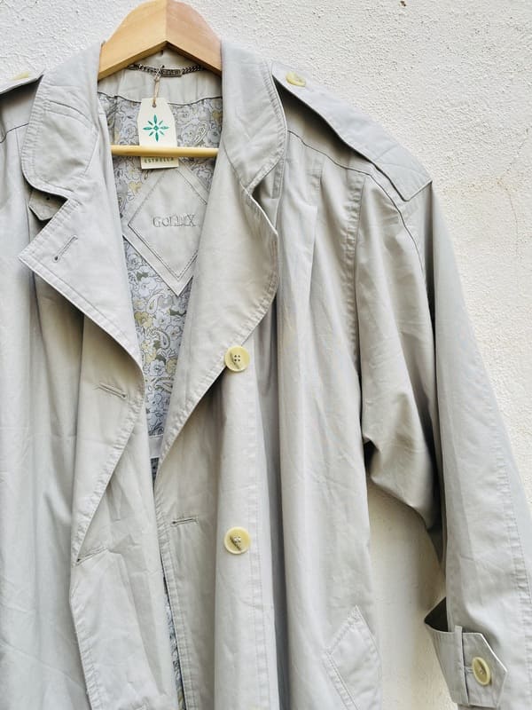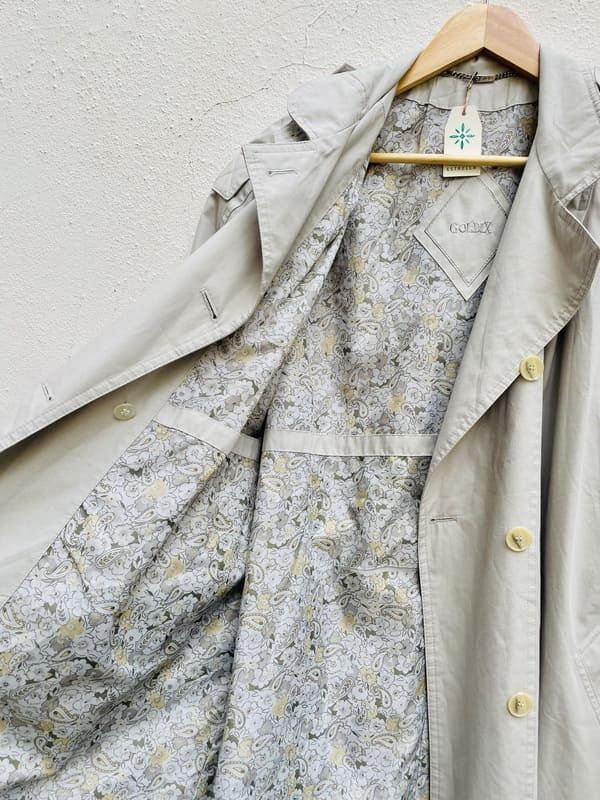 Gabardina vintage fina de la marca Goldix. Composición: 35% algodón y 65% poliéster. De forma recta y ligera campana, va de menos a más de la sisa hasta el bajo, con dos bolsillos, trabillas y cinturón, manga francesa 3/4. Interior con forro estampado. En perfecto estado.