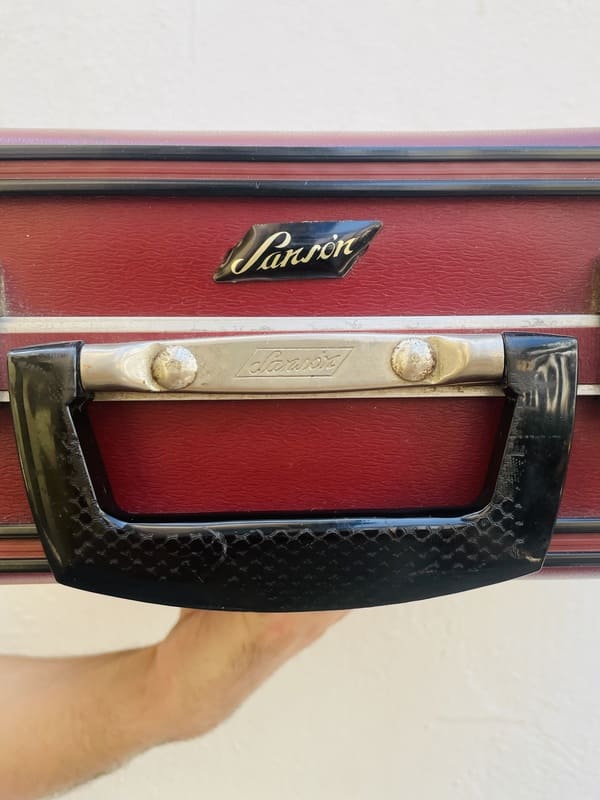 Maleta vintage original de los años setenta, marca Sansón, Made in Spain. De plástico rígido y ligero en color granate, con esquita, ribetes, tacos y asa en baquelita negra. Cierres metálicos en plateado. Interior forrado de tela de poliéster en color beige. El tejido interior está limpio y desinfectado pero tiene manchas que no se pueden eliminar, por fuera está en magnífico estado, con muy ligeros roces en las esquinas por el uso y la pátina del tiempo.