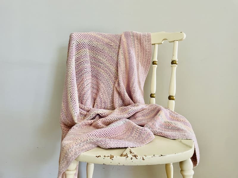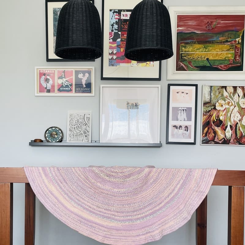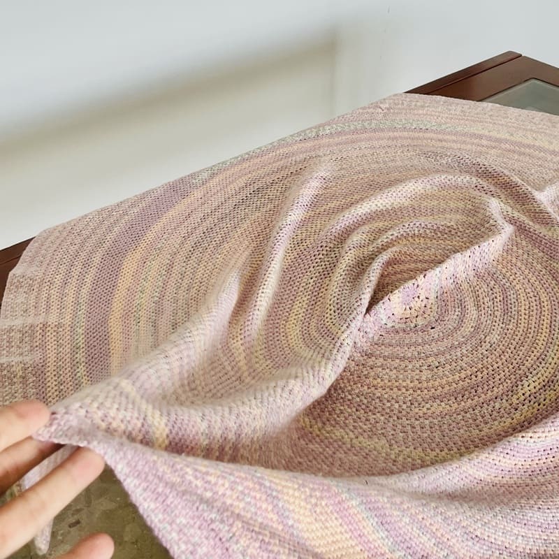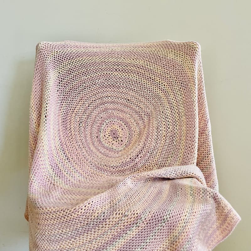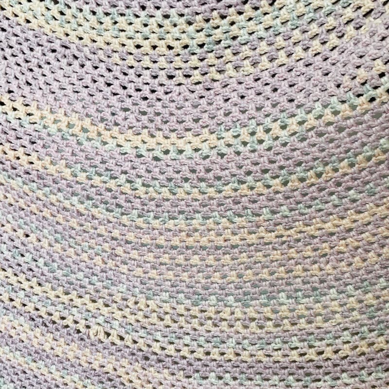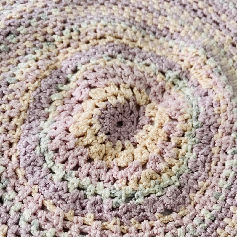 Mantel vintage de ganchillo. De forma redonda, tejida en los 70. En tonos lila y pastel entremezclados. En buen estado.