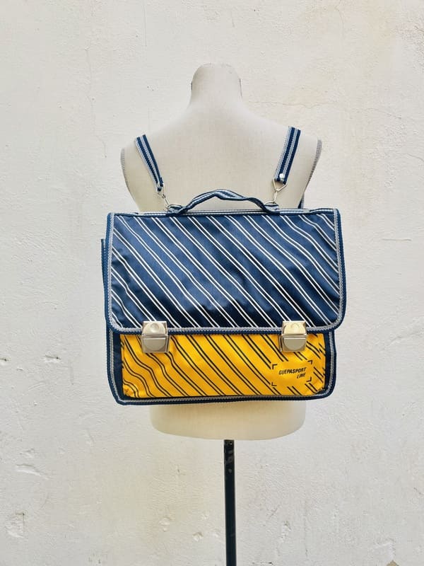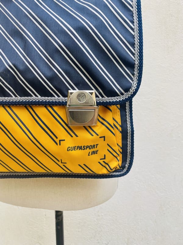 Cartera escolar vintage, original de los 70. De Guepasport Line. Made in Spain. Nueva, antiguo stock de la época. Con tirantes de quita y pon, se puede llevar como mochila, como bandolera o como cartera de mano.