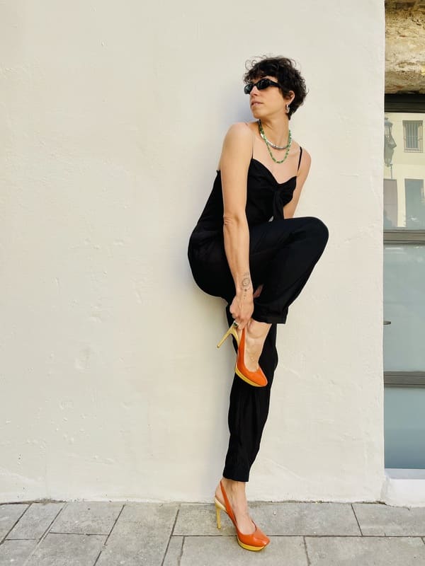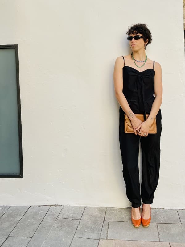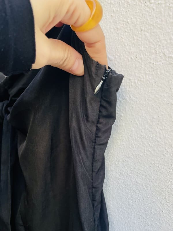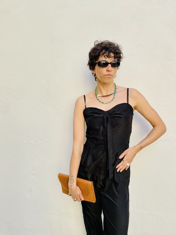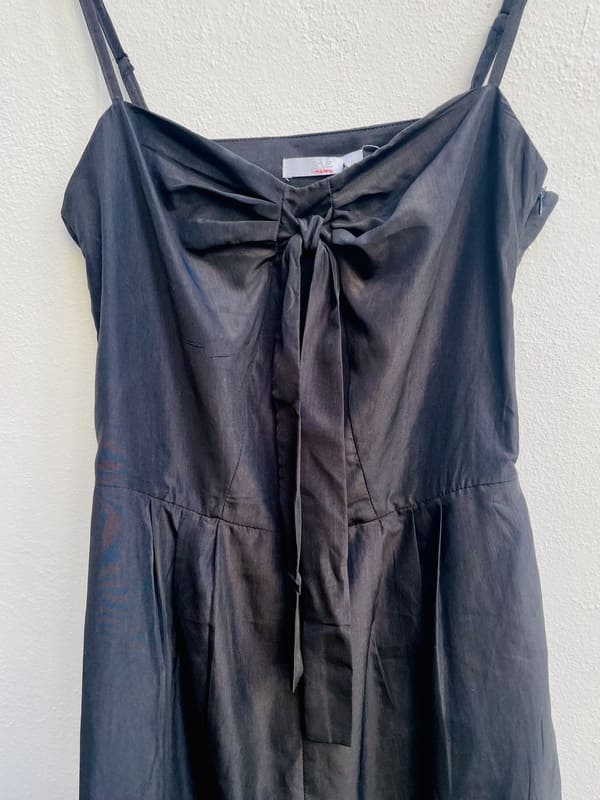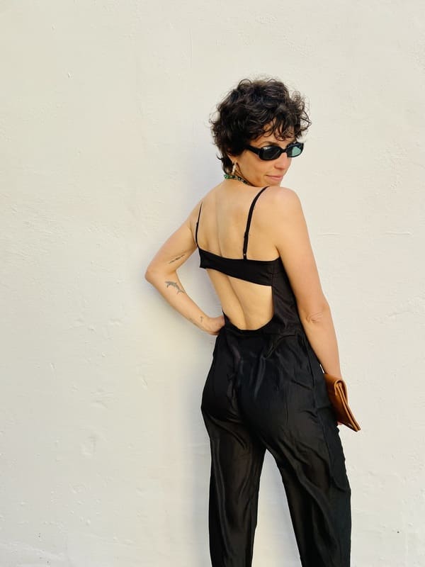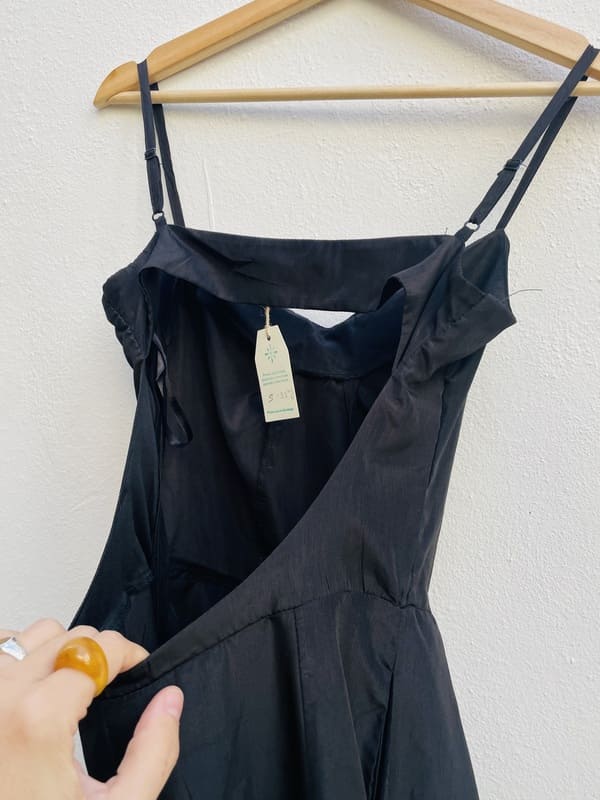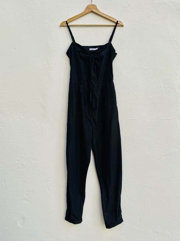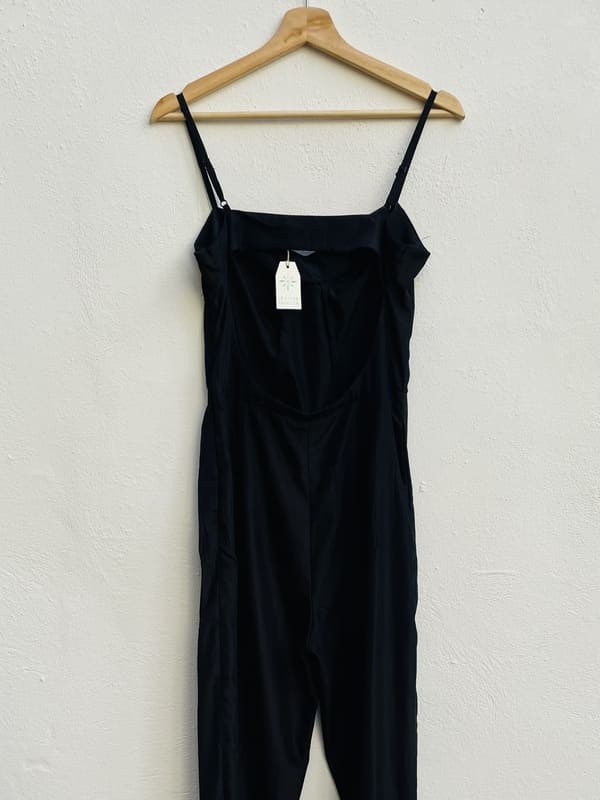 Mono vintage en color negro de la marca Love&Money. Cierre con cremallera en un lateral, tirantes regulables de longitud, con espalda escotada y con bolsillos. De poliéster satinado. Impecbale, como nuevo.