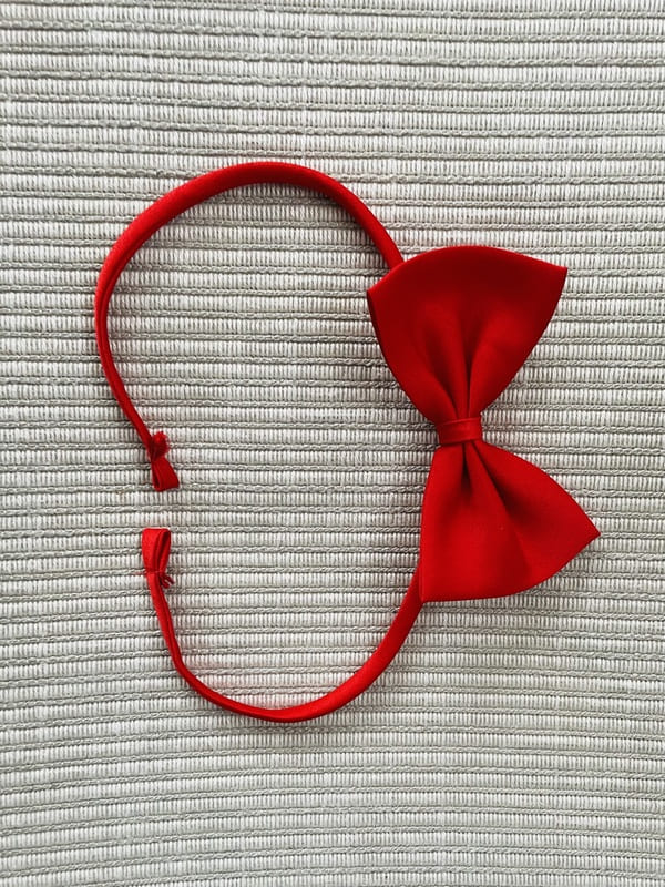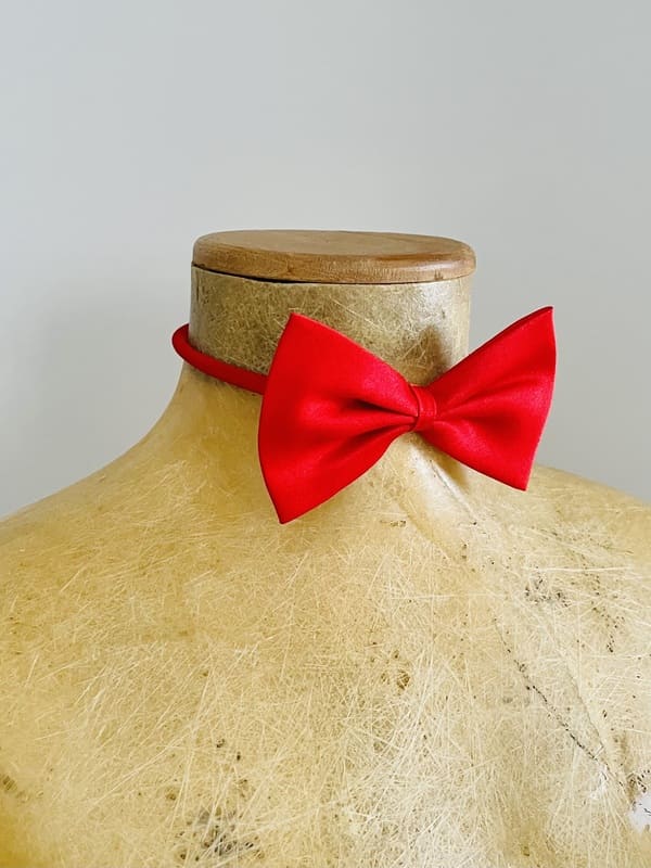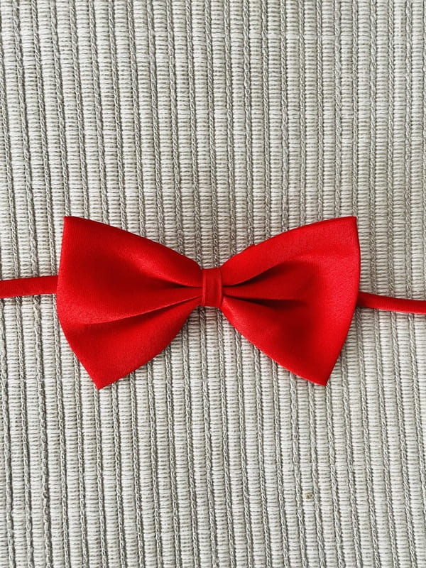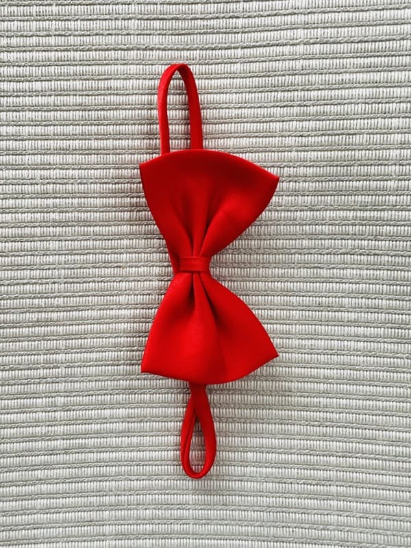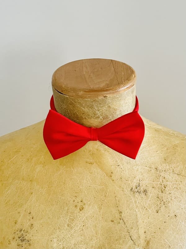 Pajarita vintage de color rojo de poliéster. En perfecto estado. Se ajusta insertando una gomilla en los dos huecos de cada extremo. Impecable, como nueva. Talla única.