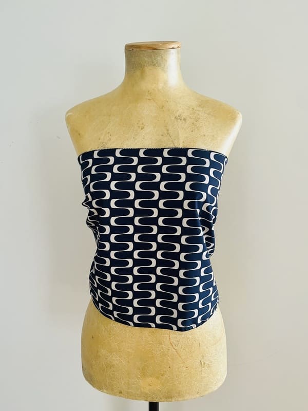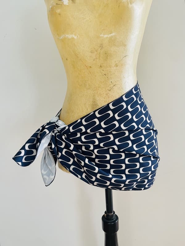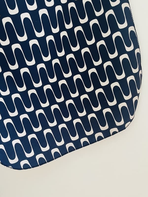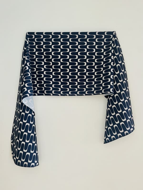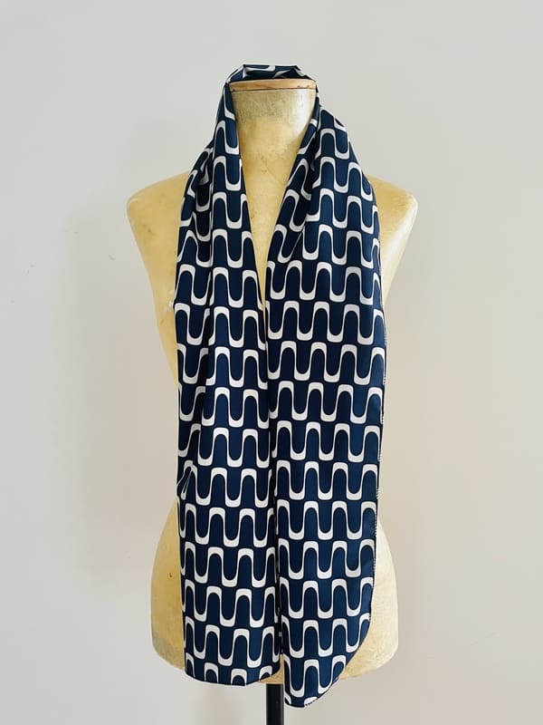 Pañuelo vintage de los setenta. De color azul marino con ondas en blanco. De forma rectangular y con esquinas redondeadas. De poliamida. Impecable. Medidas: 145 cm x 33 cm.