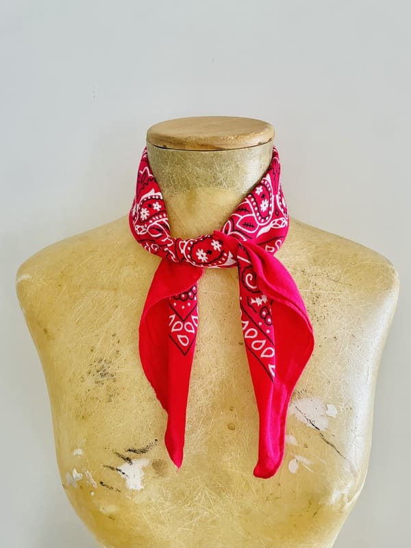 Pañuelo vintage cuadrado de color magenta con dibujos clásicos de cachemir en blanco y negro. De algodón 100%. Impecable. Medidas: 51 cm x 51 cm.