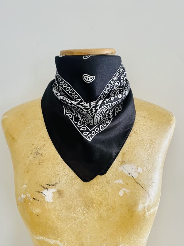 Pañuelo vintage cuadrado de color negro con dibujos clásicos de cachemir en blanco. De poliéster. Impecable. Medidas: 53 cm x 53 cm.
