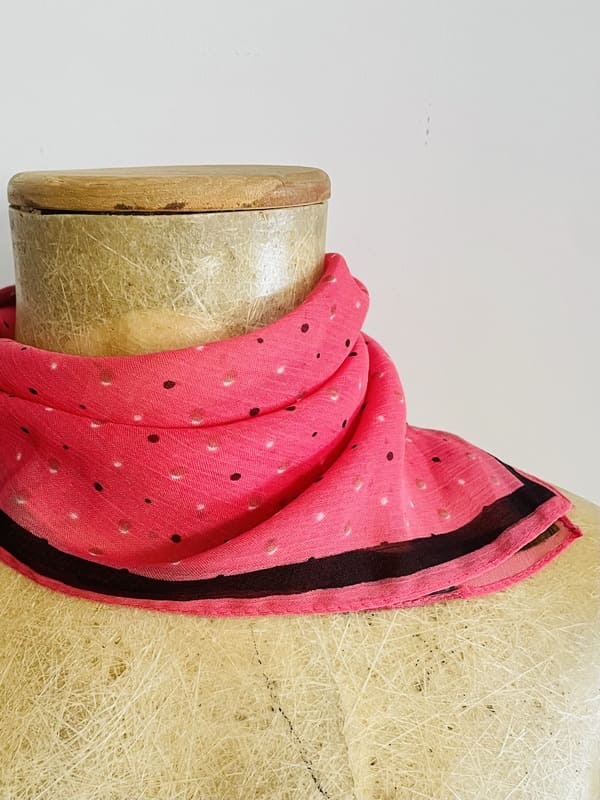 Pañuelo vintage cuadrado de crepe poliéster. De color rosa y con lunares y ribete en marrón. Impecable, como nuevo.