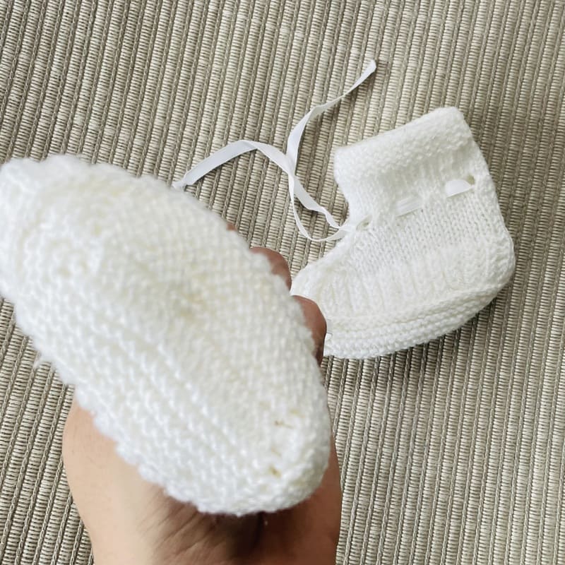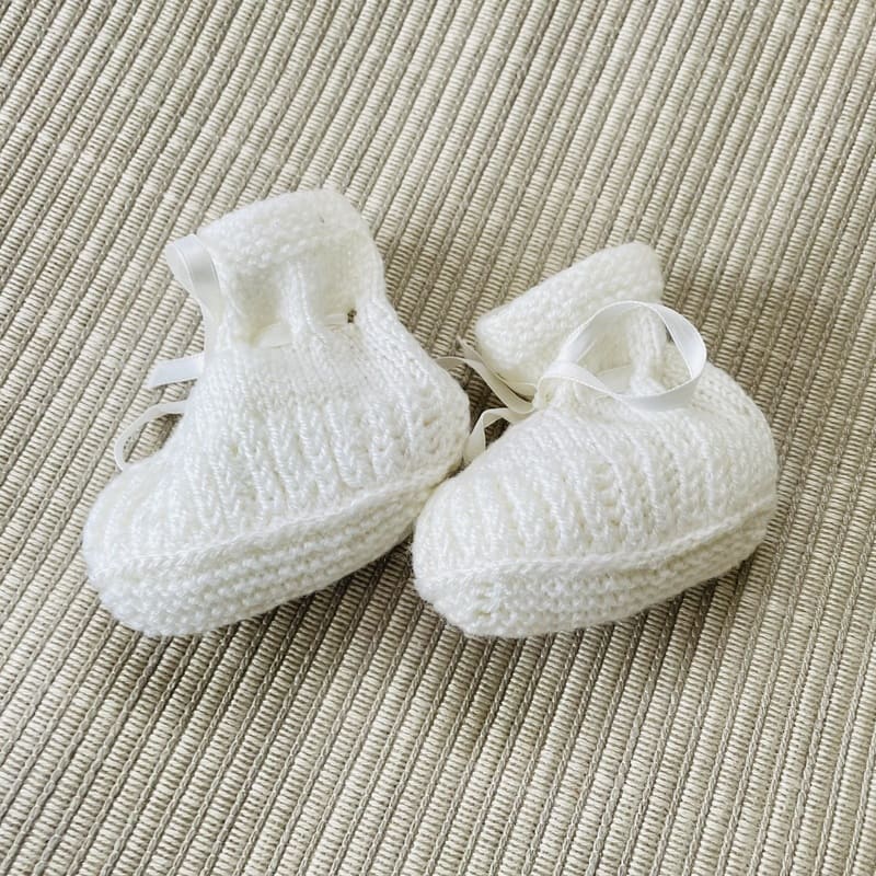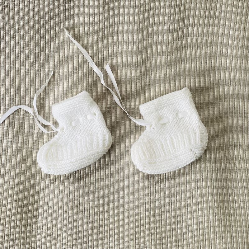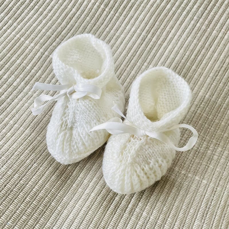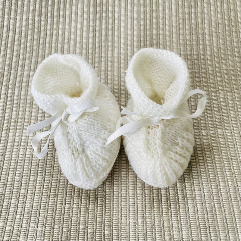 Patucos vintage para bebé. Tejidos a mano en punto muy suave de color blanco, con detalle de cinta de raso en color blanco con lazada en el tobillo. Impecables.