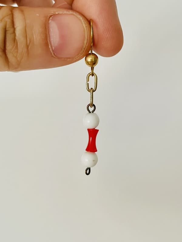 Pendientes vintage de latón en color dorado con cuentas en blanco y rojo. Nuevos, antiguo stock de los años noventa. Impecables.