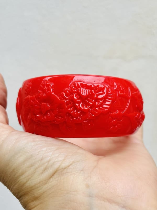 Pulsera vintage de baquelita original de los años setenta. De color rojo brillante con flores en relieve. Rígida y ligera. Impecable.