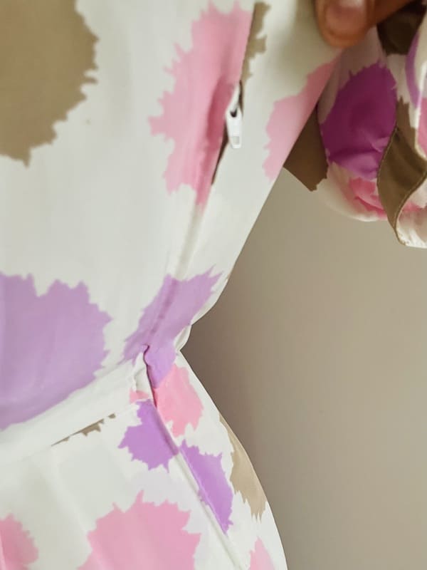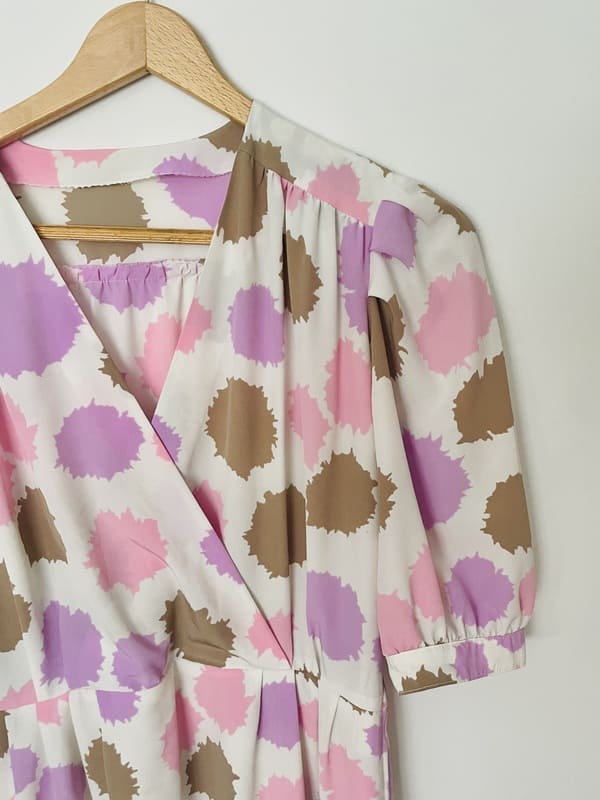 Vestido vintage de largo midi. Composición desconocida, similar al crepe de poliéster. Estampado en rosa, malva y visón sobre fondo blanco. De escote cruzado, manga farol, entallado a la cintura y con cinturón a juego. Cierre con cremallera en un lateral. Lleva forro interior. Impecable, como nuevo.