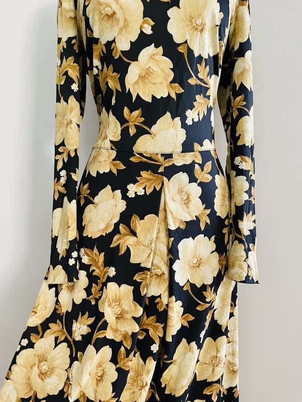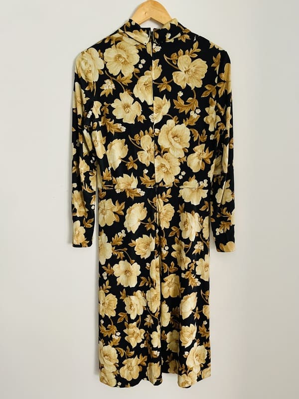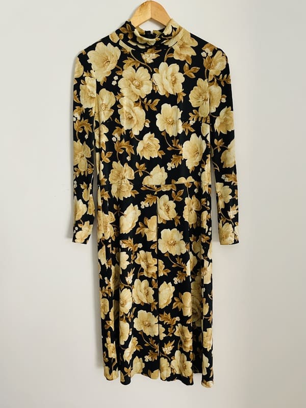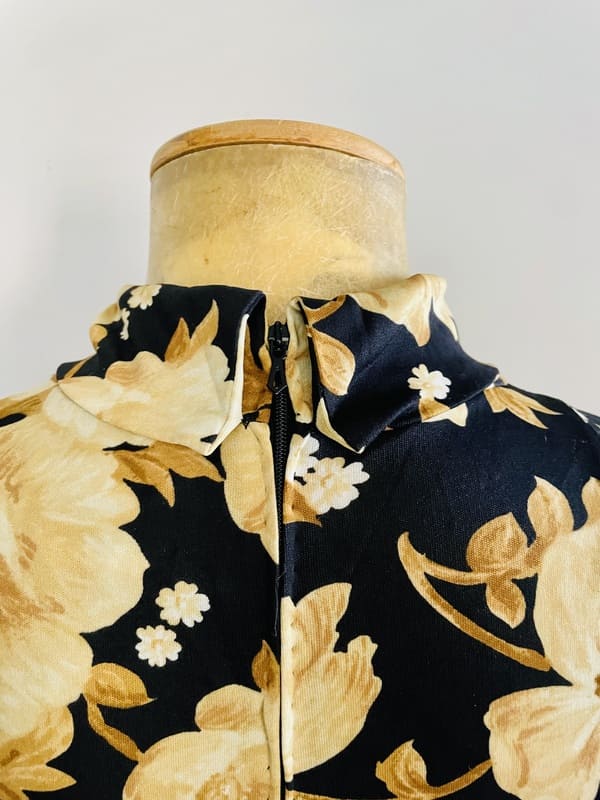 Vestido vintage midi. De Prince Carmino, París, Made in France. De poliamida, elástico. De estampado floral en beige sobre fondo negro. Con cuello vuelto semi-cisne, cierre con cremallera en la espalda y falda con un tabla/plisado en el centro. Impecable, en perfecto estado.
