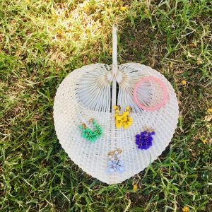 Además del bolso redondo y el paypay de mimbre, os proponemos llevar los pendientes Lía, en cualquiera de estos cuatro colores quedan genial con los colores de este vestido. Nuestros predilectos en este look para romper más y destacar el morenito son los amarillos. Y por último una preciosa pulsera rosa de baquelita de los 70.