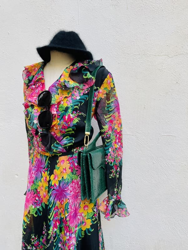Hoy una combinación básica en primavera: vestido + rebeca. A esta preciosidad de vestido midi setentero le hemos añadido rebeca larga de canalé y pañuelo, ambos en distintos tonos de verde. Rompemos el color con bolso y cinturón marrón piel y rematamos con gafas maxi retro en color crema. Y listo, a disfrutar de Antique Market.