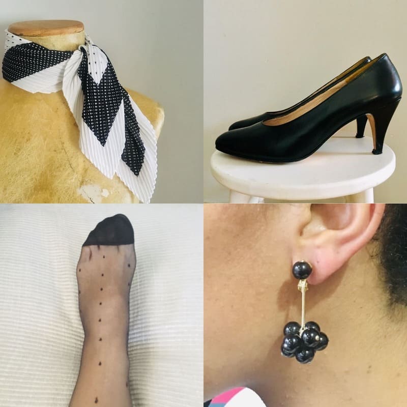 Pañuelo plisado en forma de rombo en blanco y negro con pequeños lunares. Solo nos atrevemos a romper el total-black con los siempre elegantes y atemporales lunares en blanco y negro. De poliéster, muy sedoso. 55 cm x 73 cm. 8,95€.