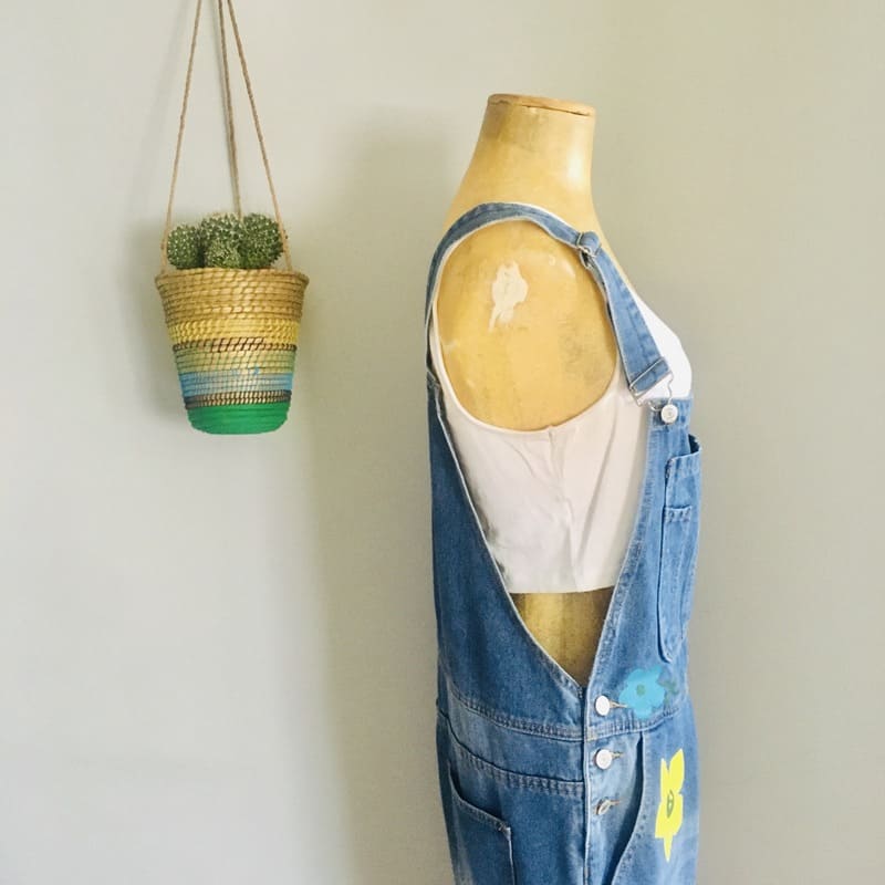 Para nuestro outfit de peto vaquero hemos elegido los que más nos gustan, los de pantalón en versión holgada oversize. Este además tiene flores pintadas en la parte delantera de las piernas.