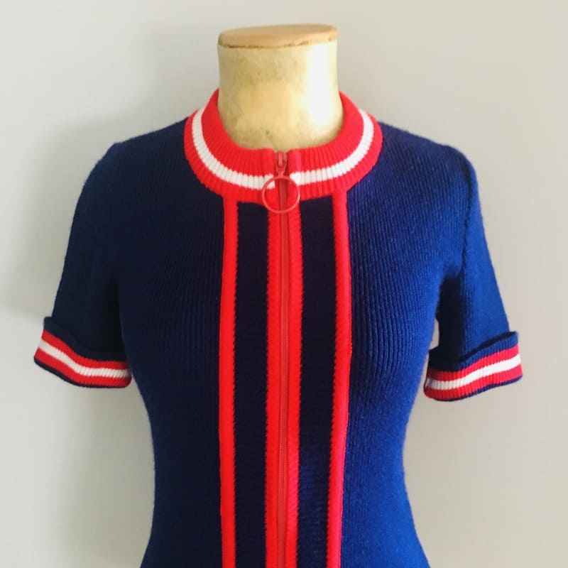 Jersey vintage de niño. Nuevo, etiquetado y a estrenar de la marca Chelín. Made in Spain, años 80. En color verde con cenefas de rombos rojos en cuellos y mangas. Con dibujo bordado de pingüino en el centro.