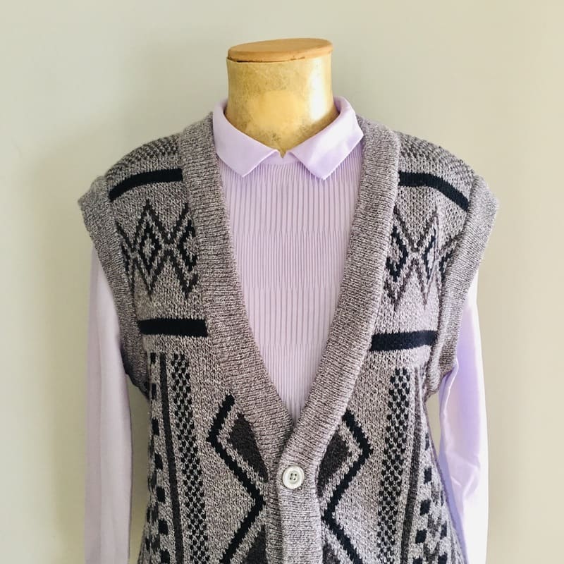 En este caso hemos combinado prendas para crear un look en tonos lavanda y gris, los colores del chaleco. Hemos elegido una blusa lila plisada de los 80 con una falda recta de paño en gris marengo. Y hemos superpuesto un cinturón sobre la blusa para acentuar la cintura, creando un conjunto que aunque formal, resulta muy relajado y cómodo al añadirle el chaleco.