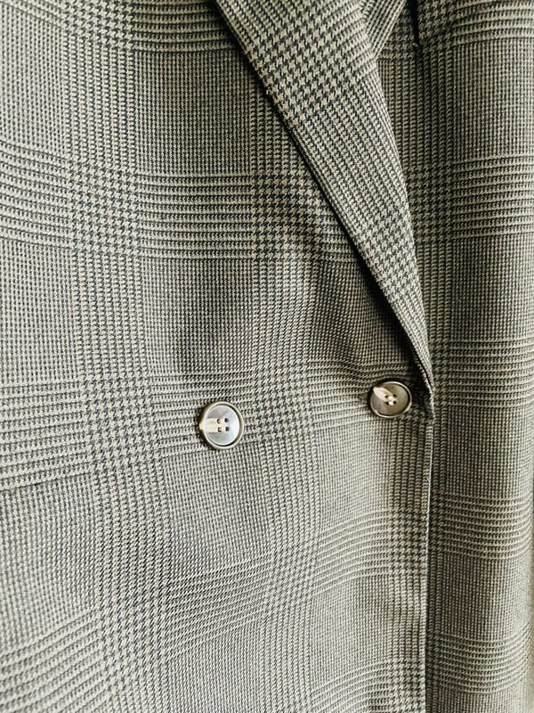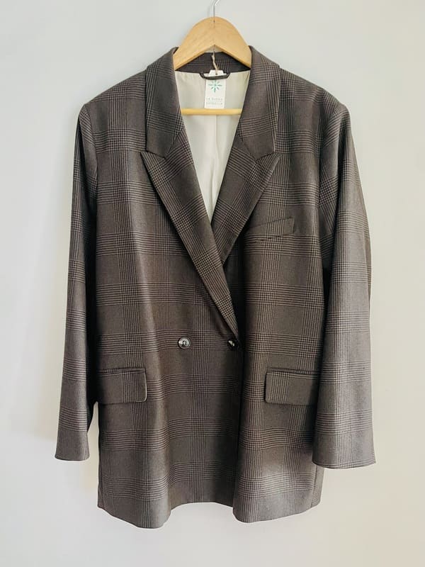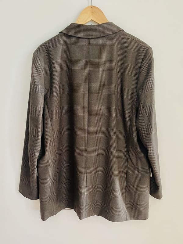 Blazer secondhand impecable y como nuevo. De color marrón son dibujo de cuadros de punto de gallo en negro y forro en color beige. De poliéster. De froma recta, cierre con doble botonadura y tres bolsillos. Impecable.