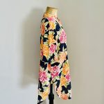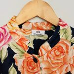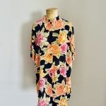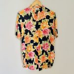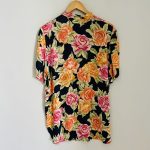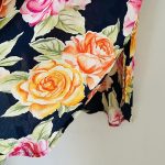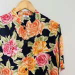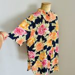 Camisa vintage de cuello mao con estampado de rosas sobre fondo azul marino. De viscosa 100%. De forma recta y con aberturas laterales. Años 90. Impecable, en perfecto estado.