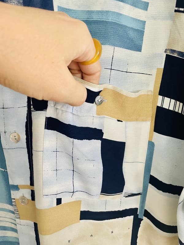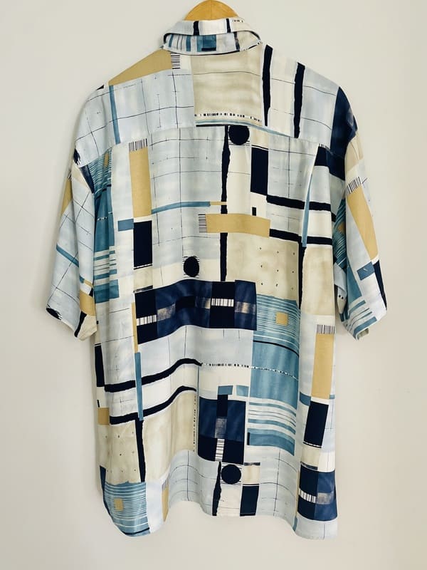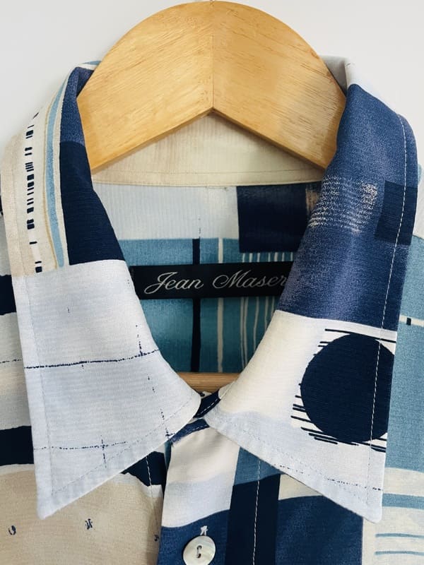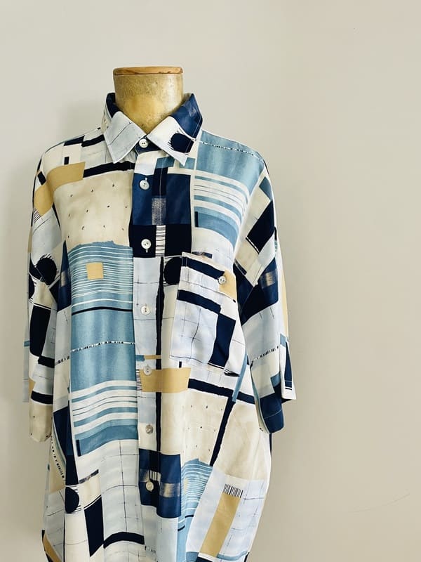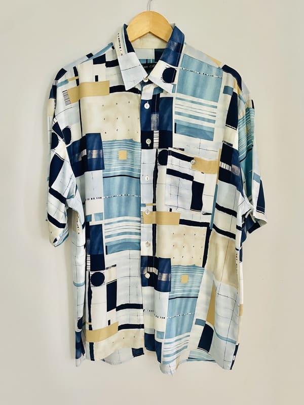 Camisa vintage de los años noventa de Jean Maserich. De viscosa 100% con dibujos estampados en tonos azul y beige. De forma recta, con un bolsillo a un lado del pecho. Impecable, como nueva.