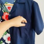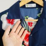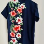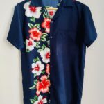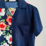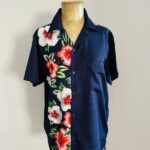 Camisa hawaiana de poliéster de VHO. De forma recta, con cuello sastre y un bolsillo a un lado del pecho. De color azul marino liso por una parte y con dibujo de flores hawaianas por la otra.
