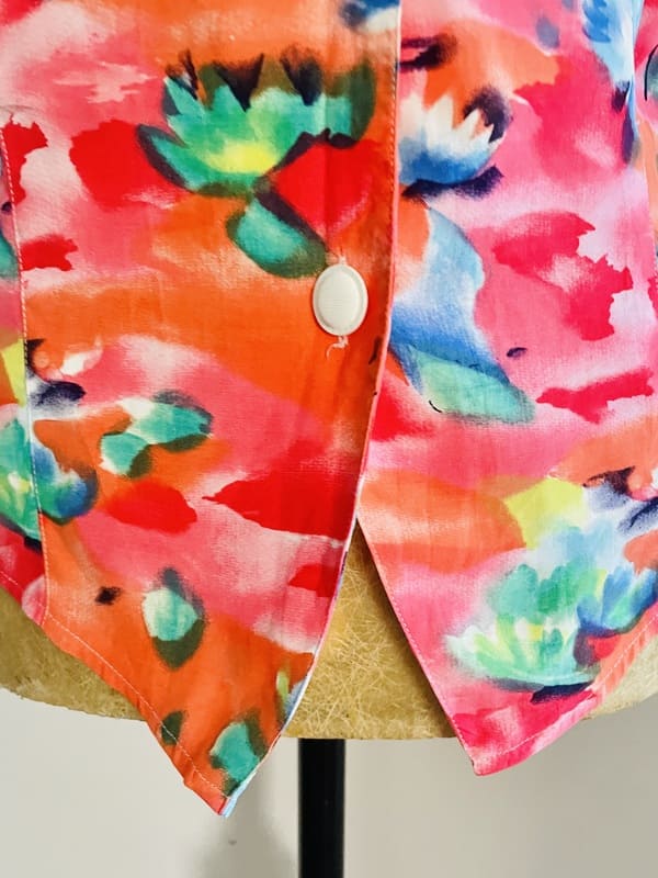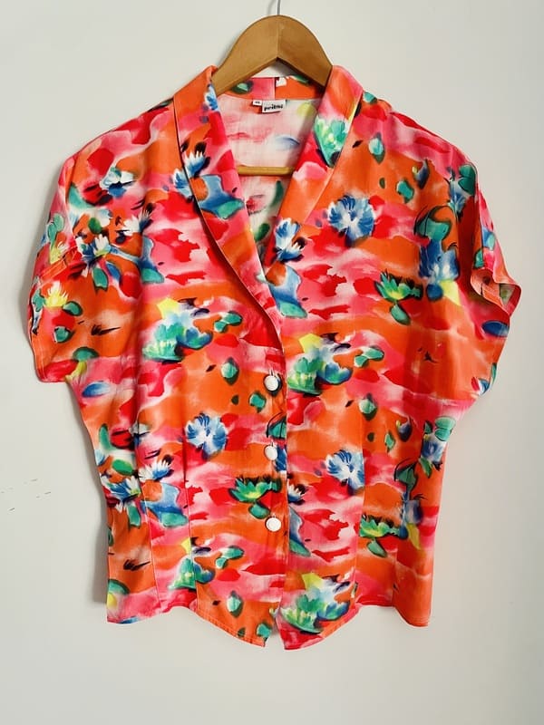 Camisa vintage de la marca Pritti de viscosa 100%. De color anaranjado/coral con estampado floral. Con manga corta murciélago sin costura en hombros y con pinzas entallando la cintura. Impecable, como nueva.
