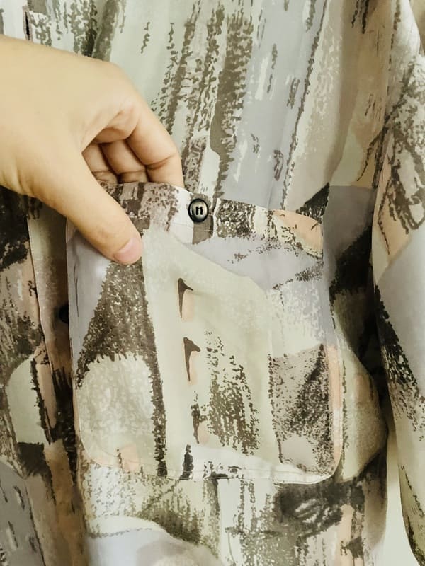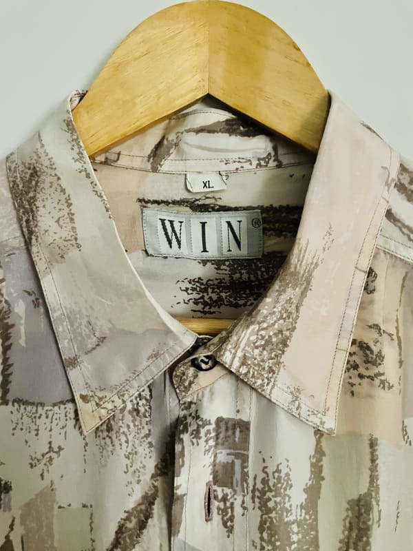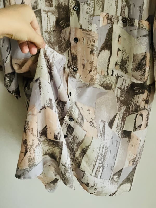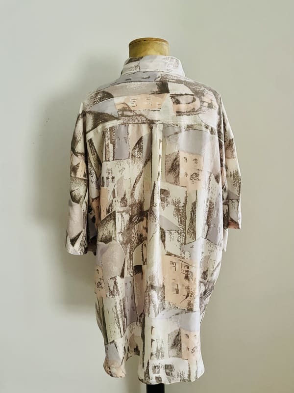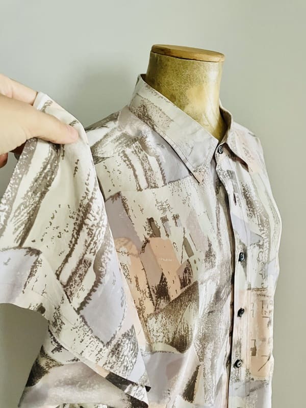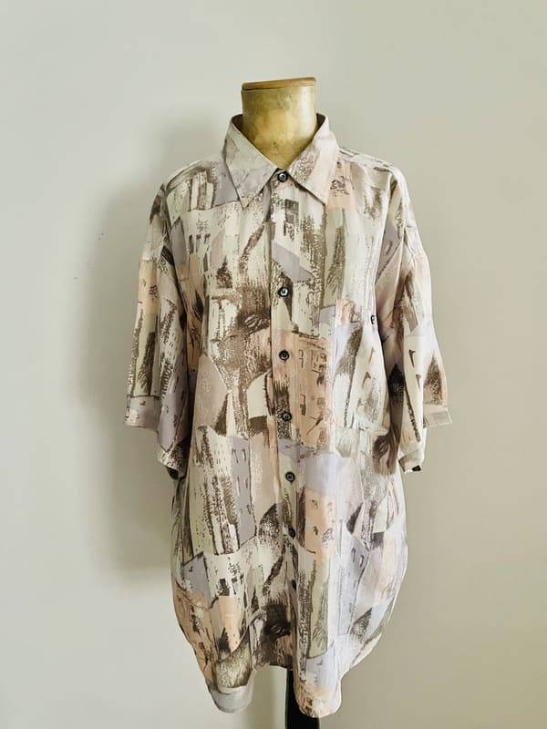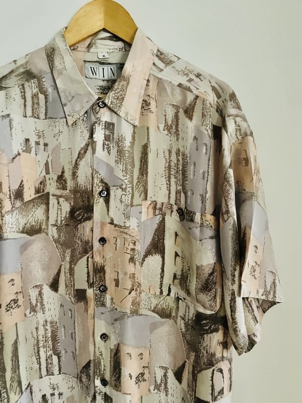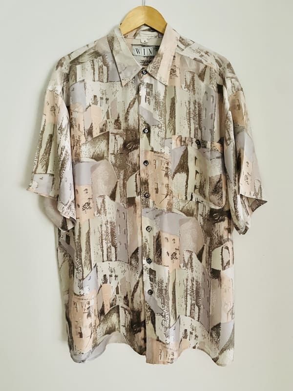 Camisa vintage de seda 100% de la marca Win. De manga corta, forma recta y con un bolsillo a un lado del pecho. Con estampado de casas en tonos claros, beige, gris y marrón. En perfecto estado, como nueva.