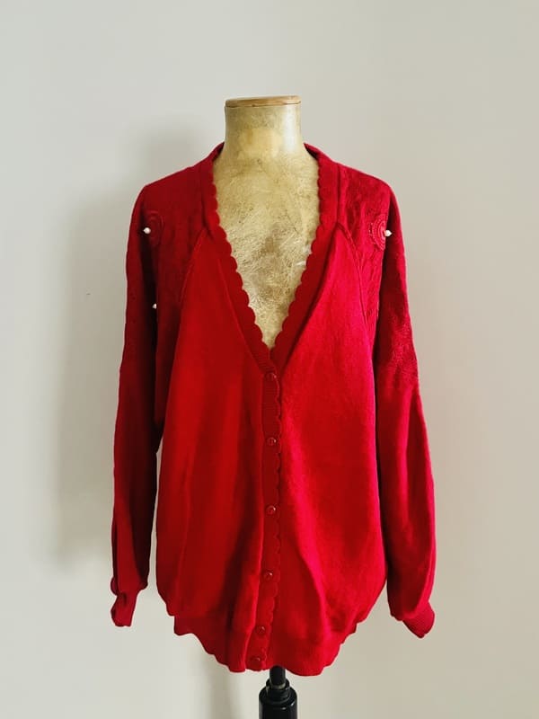 Cárdigan vintage de punto acrílico en color rojo de los años ochenta. Made in Italy. De forma recta, con mangas murciélago y con detalles calados y con perlitas en los hombros. En perfecto estado.