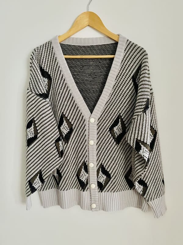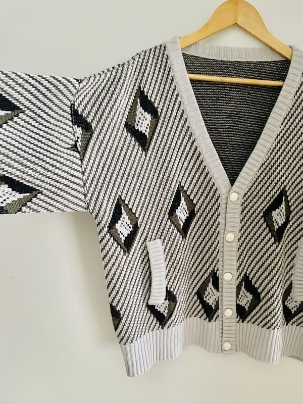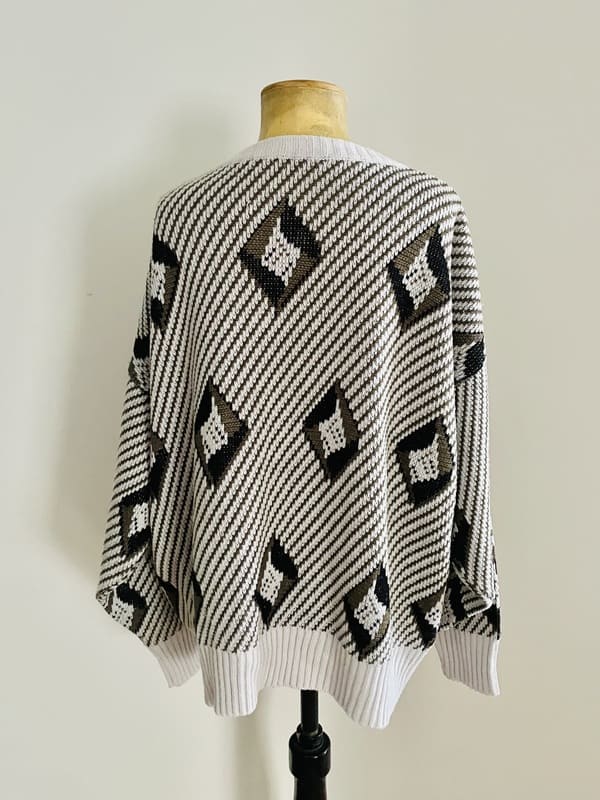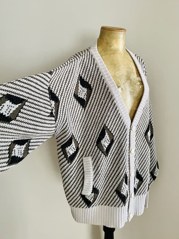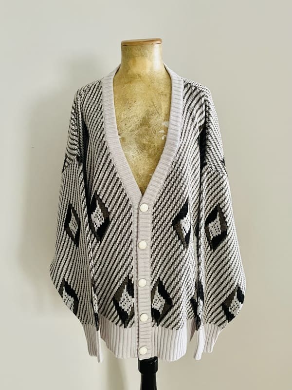 Cárdigan vintage oversize de punto de los años ochenta. En mezcla de acrílico en color gris claro y negro formando líneas y rombos. De forma recta y holgada, amplia de sisa y mangas. Con bolsillos y escote amplio de pico. En perfecto estado