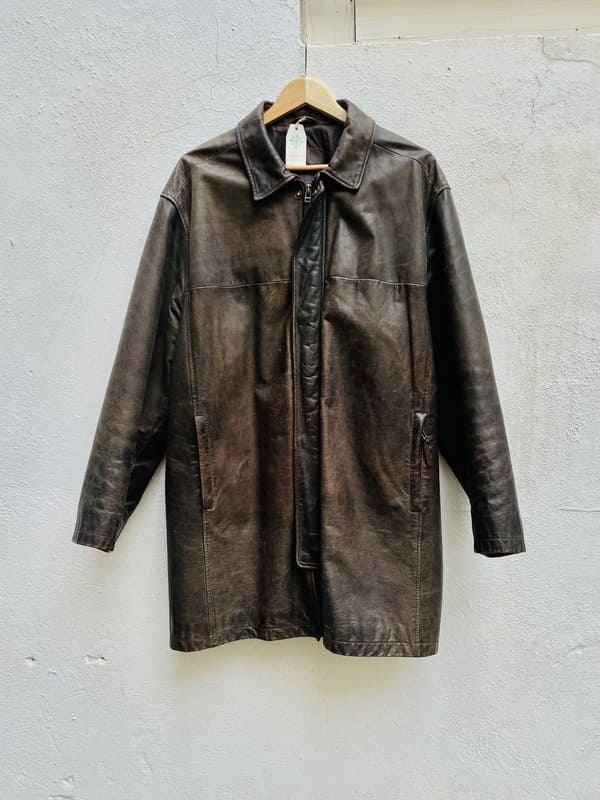 Chaquetón vintage de piel 100% de Hervás Piel. De forma recta, color marrón oscuro. Cierre con cremallera y botones. Tiene dos bolsillos exteriores que cierran con cremallera y dos bolsillos más en el forro interior. Impecable, como nuevo.