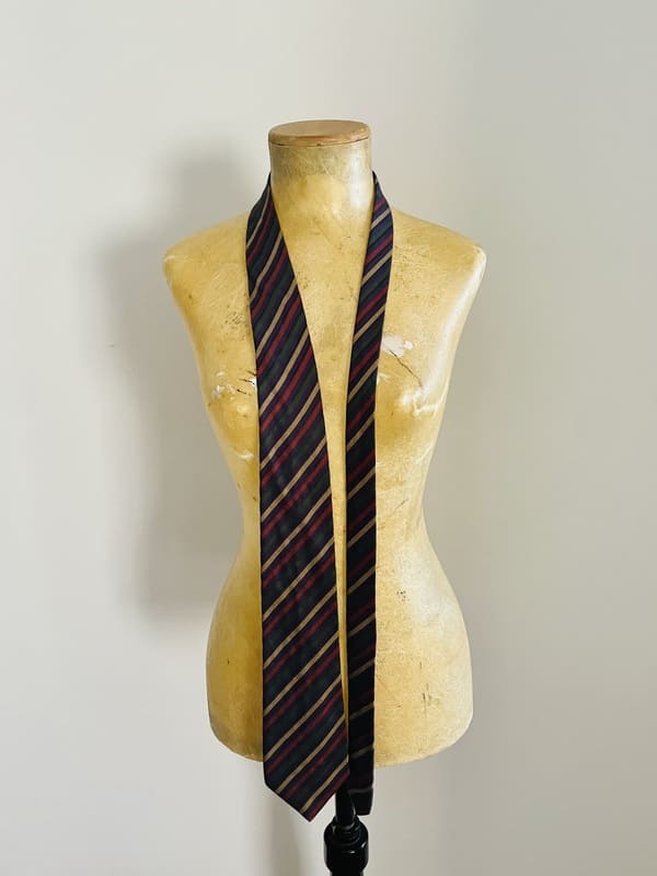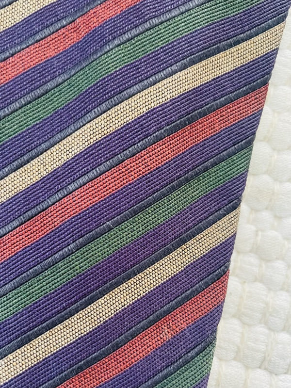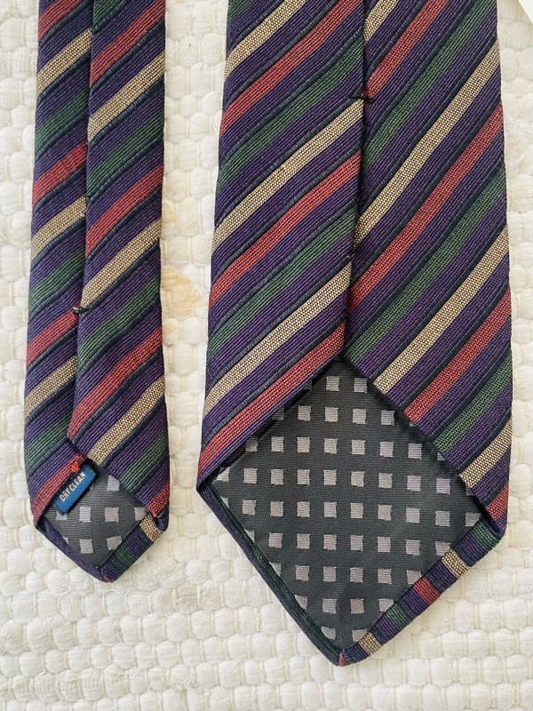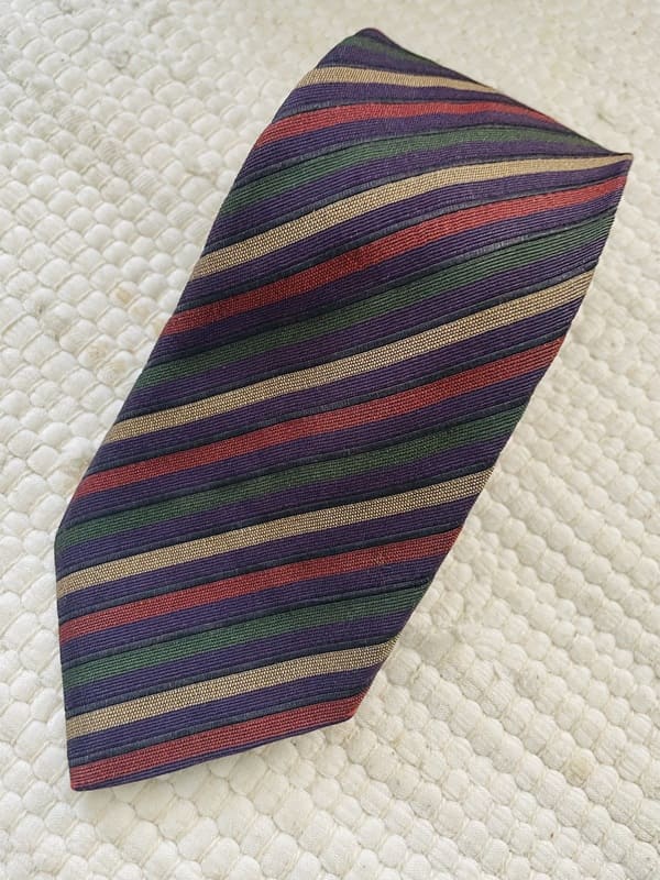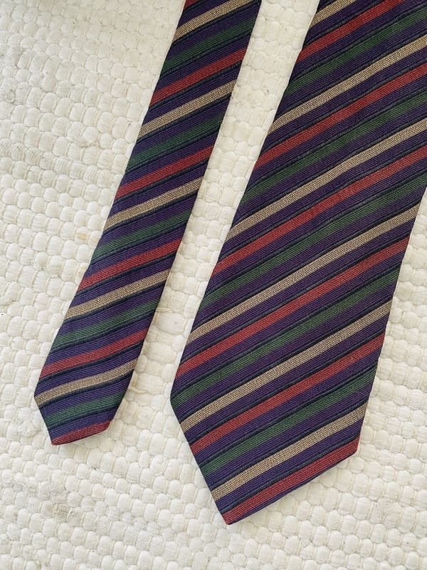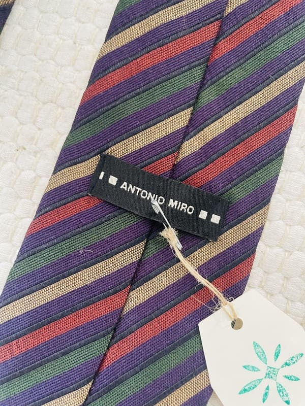 Corbata secondhand de seda 100% de Antonio Miró. Con dibujo de rayas perpendiculares en azul, vrrde, rojo y beige. Impecable, como nueva.