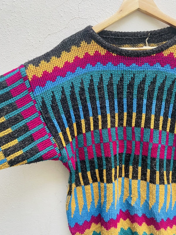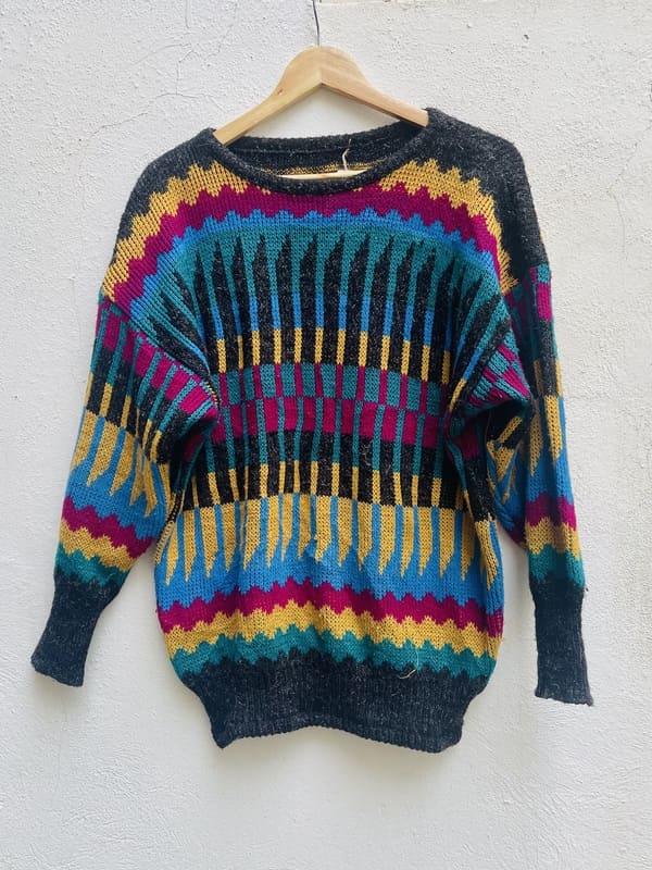 Jersey vintage de los años 80 de punto poliacrílico. Con mangas amplias murciélago, cuello amplio barco y con cenefas horizontales de colores. En buen estado.